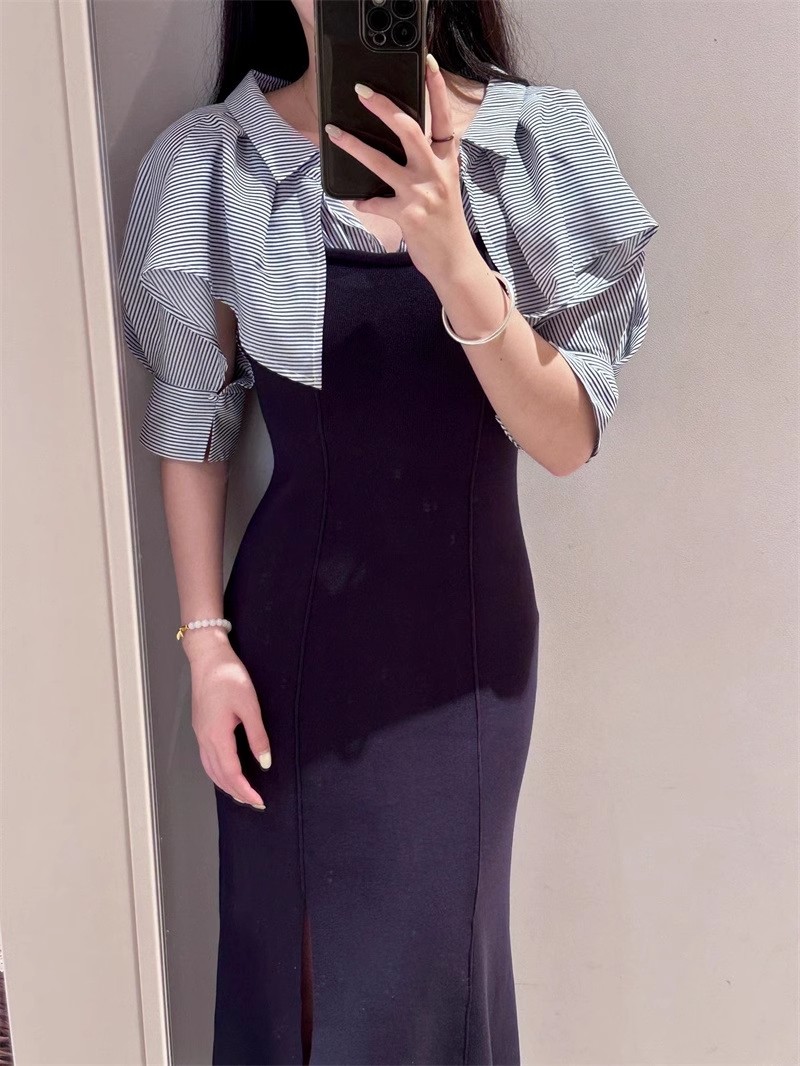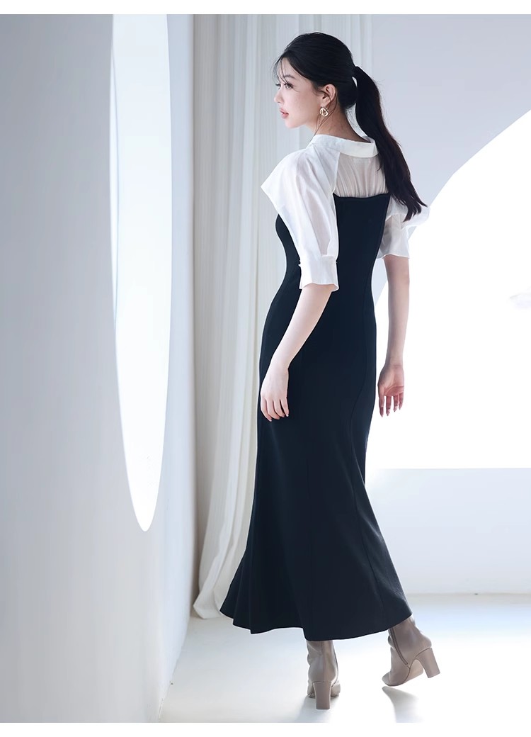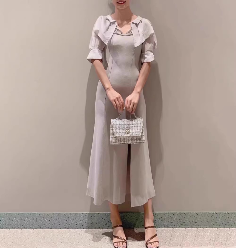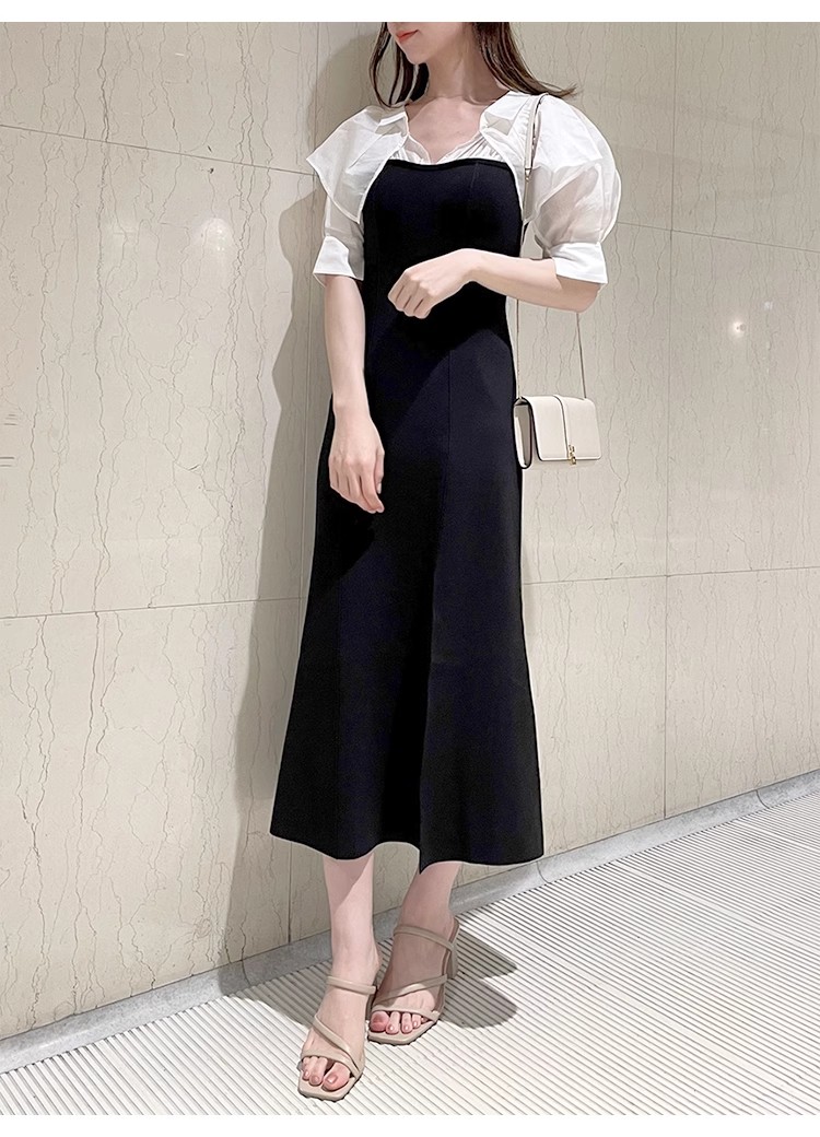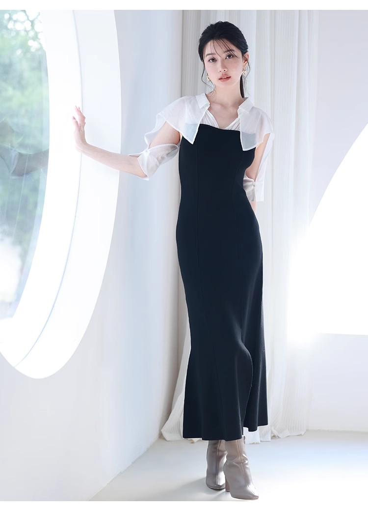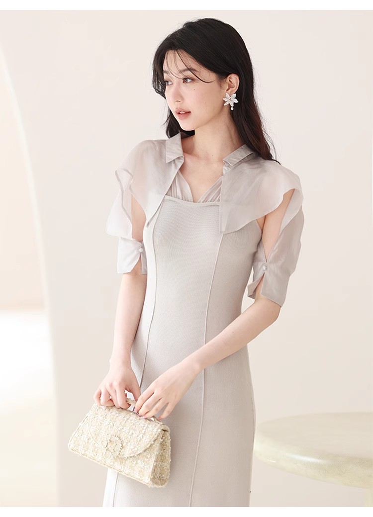インにシャツをレイヤードしているかのような、ドッキングデザインのワンピース。ひらりと広がるフリルや袖のスリットで、女性らしいエッセンスをプラスしました。ボディにはストレッチ入りのニットを使用し、程よいフィット感のある美シルエットを演出。裾には深めにスリットを入れ、今年らしい抜け感を添えています。