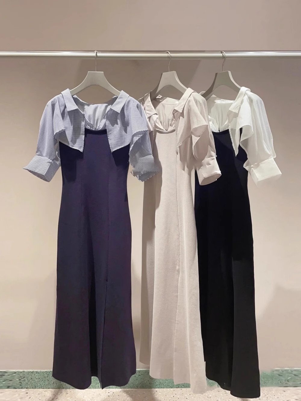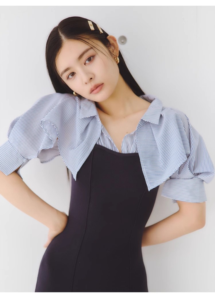 ベースには程よい肉感のニット素材を使用しました。シャツ部分にシアー生地を使用したブラックとグレーベージュ、ストライプ地を使用したネイビーの3色展開でお届けします。