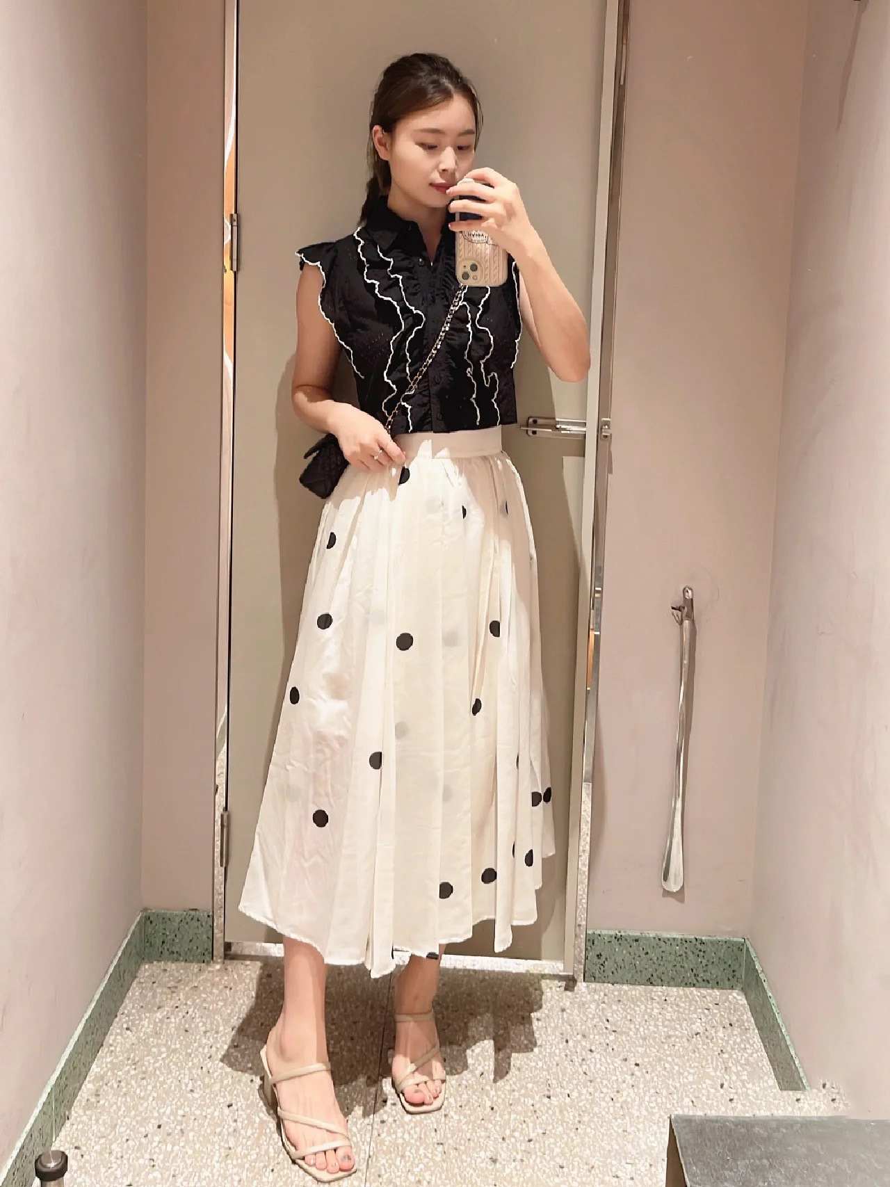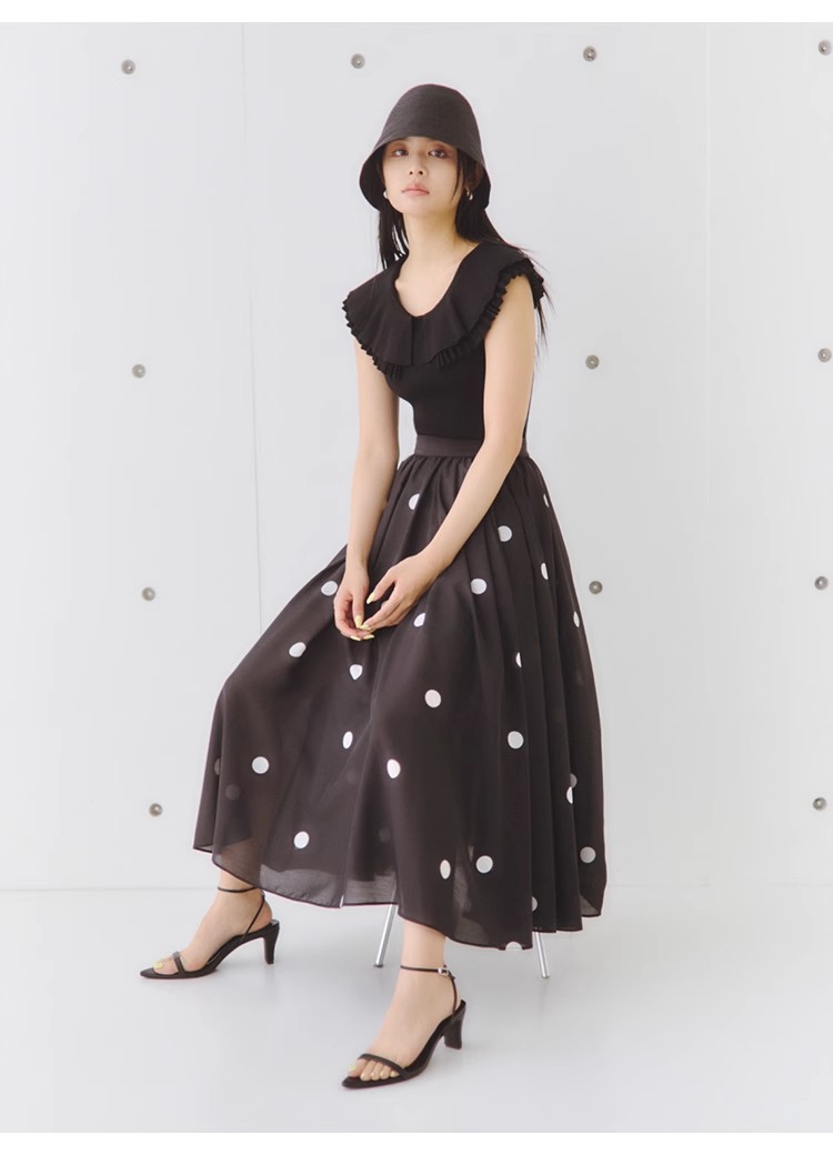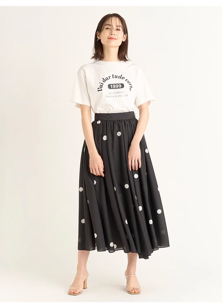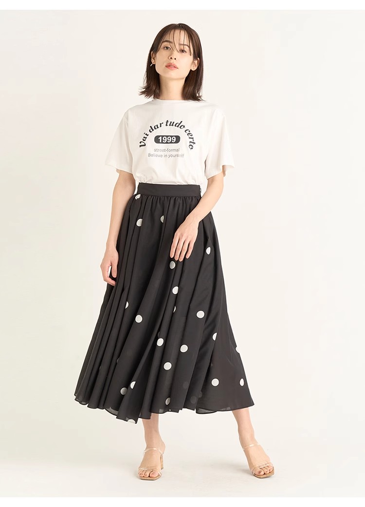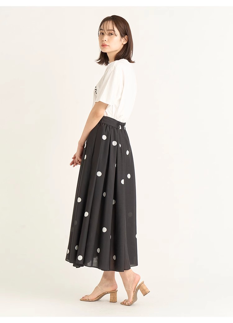 分量感たっぷりに広がるフレアラインと軽やかな素材感で、シーズンムード高まるボリュームスカート。動作のたびにひらりと揺れ、女性らしさと華やかさを演出します。大きめのランダムドットが新鮮で、甘くなり過ぎないのも嬉しい。バックウエストにはゴムギャザーを効かせているので程よいフィット感があり、穿き心地も快適です。