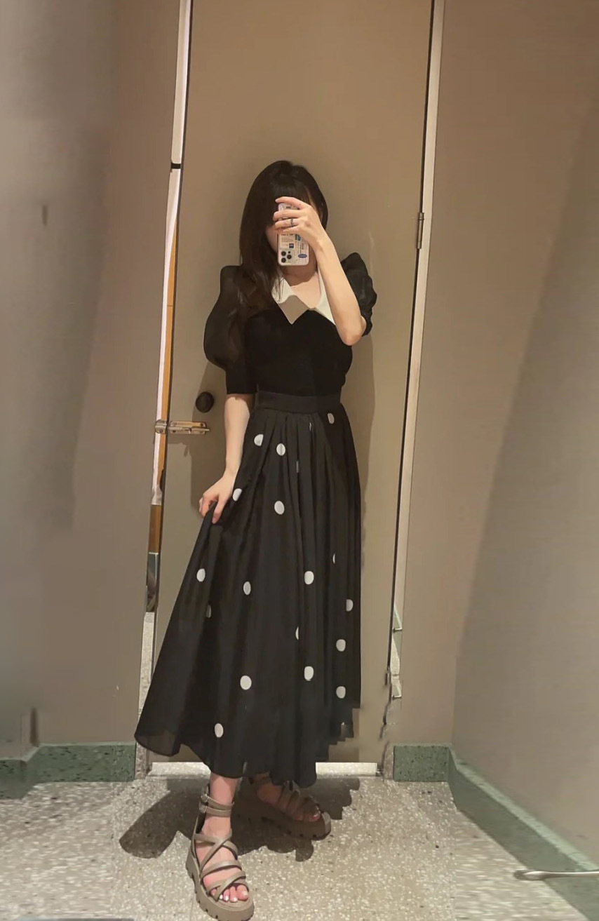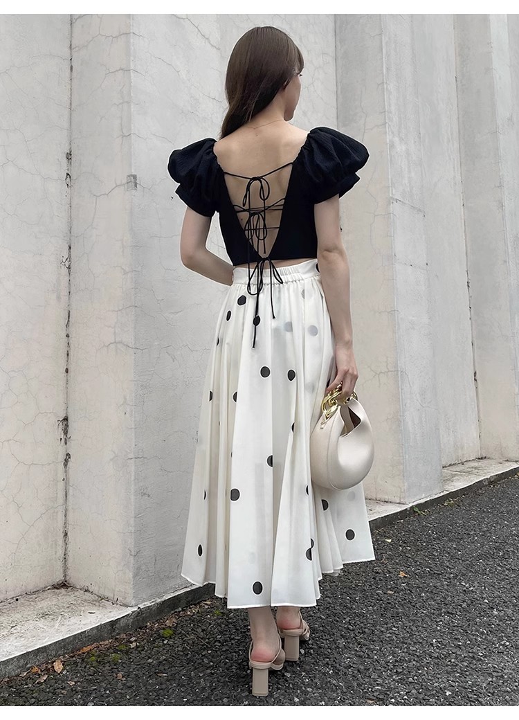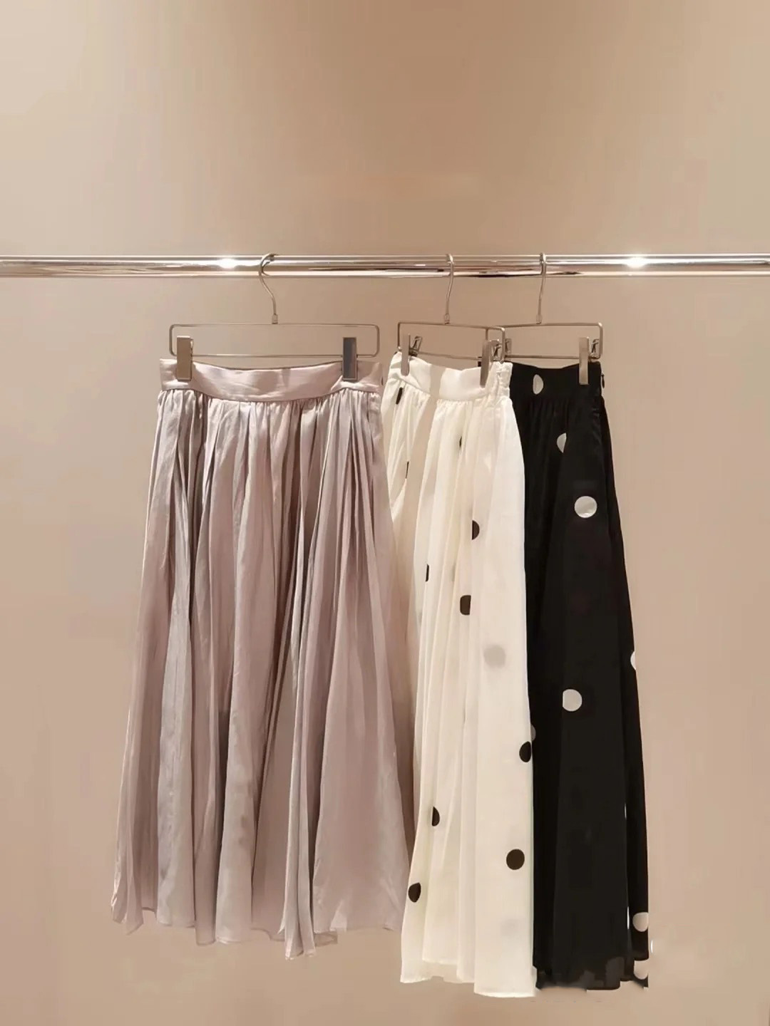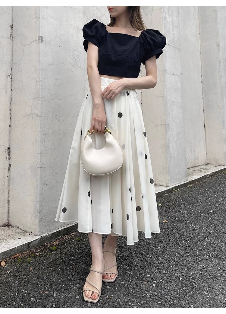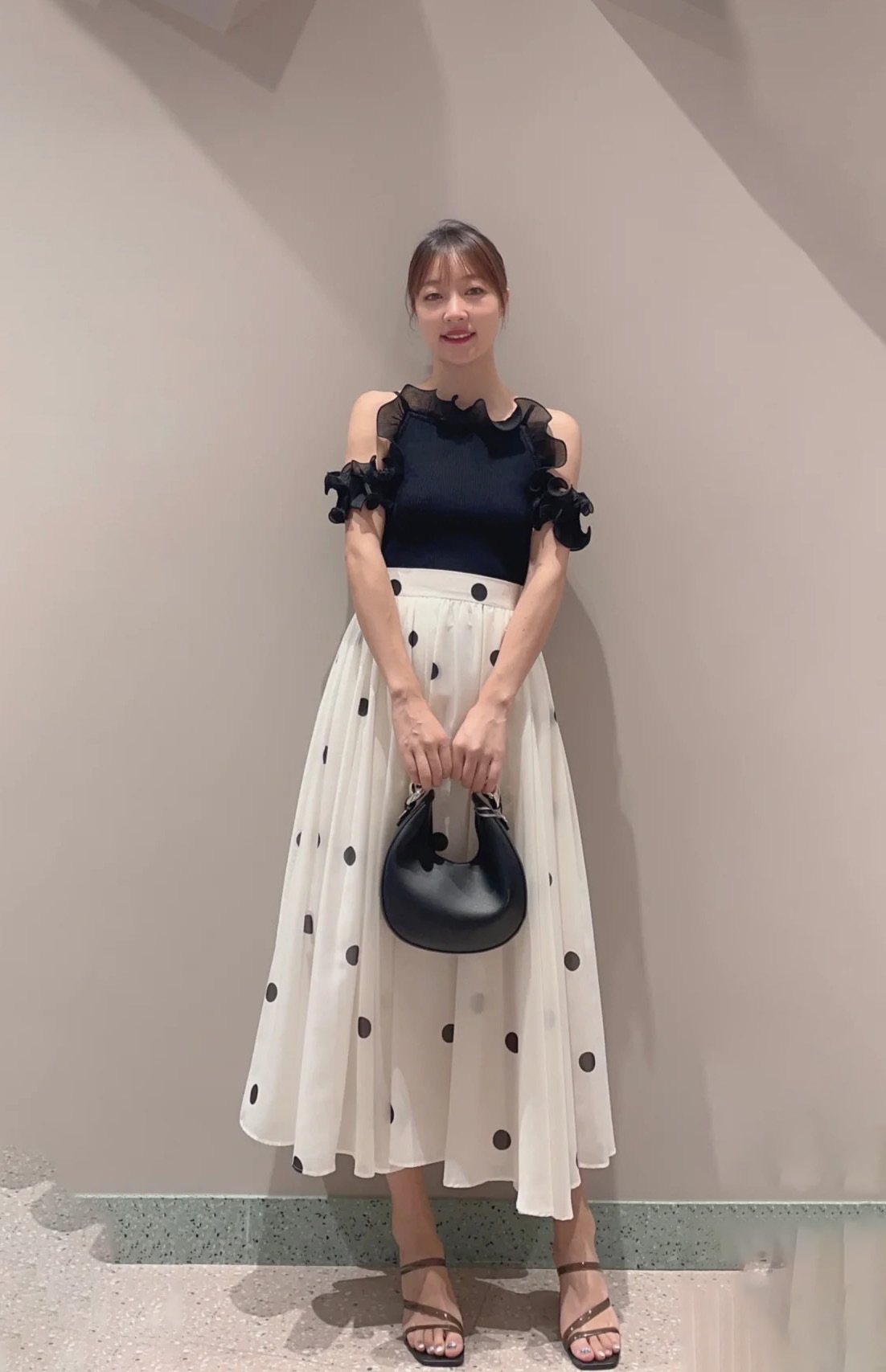分量感たっぷりに広がるフレアラインと軽やかな素材感で、シーズンムード高まるボリュームスカート。動作のたびにひらりと揺れ、女性らしさと華やかさを演出します。大きめのランダムドットが新鮮で、甘くなり過ぎないのも嬉しい。バックウエストにはゴムギャザーを効かせているので程よいフィット感があり、穿き心地も快適です。