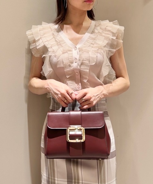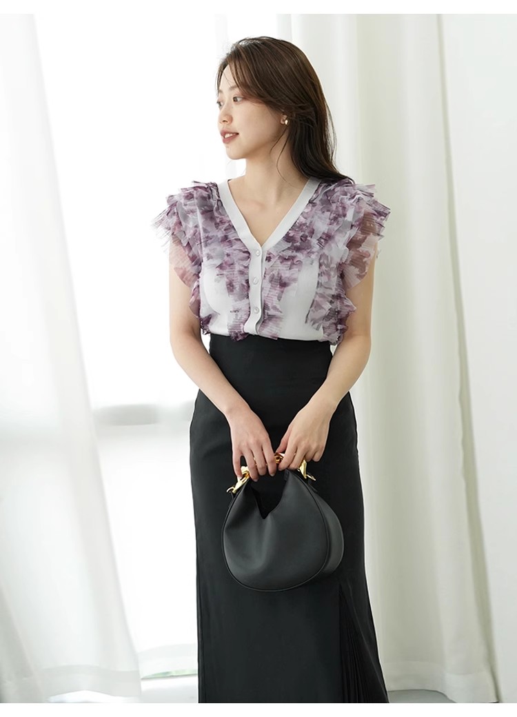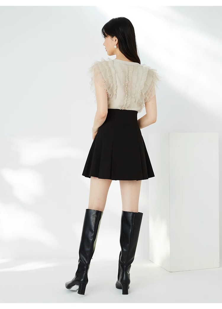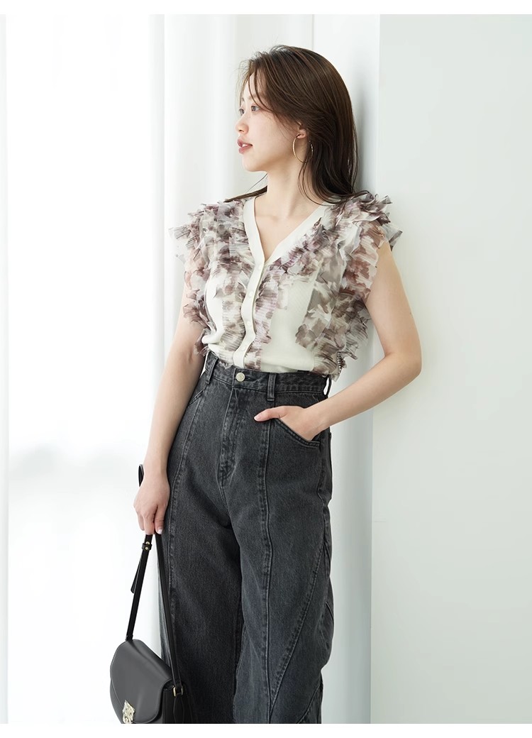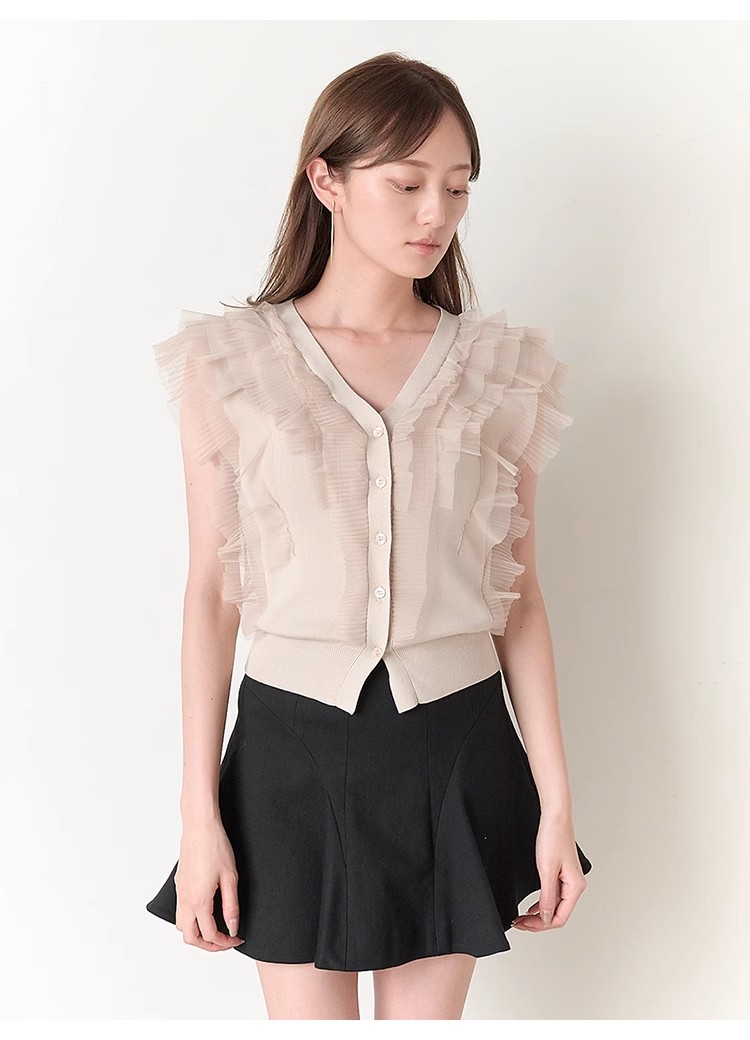 綺麗めな質感のニットにチュールフリルをドッキングしました。淡い色合いで女性らしさ高まるピンクベージュ、ベージュ、ラベンダーの3色展開でお届けします。