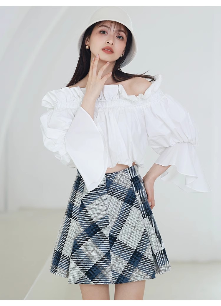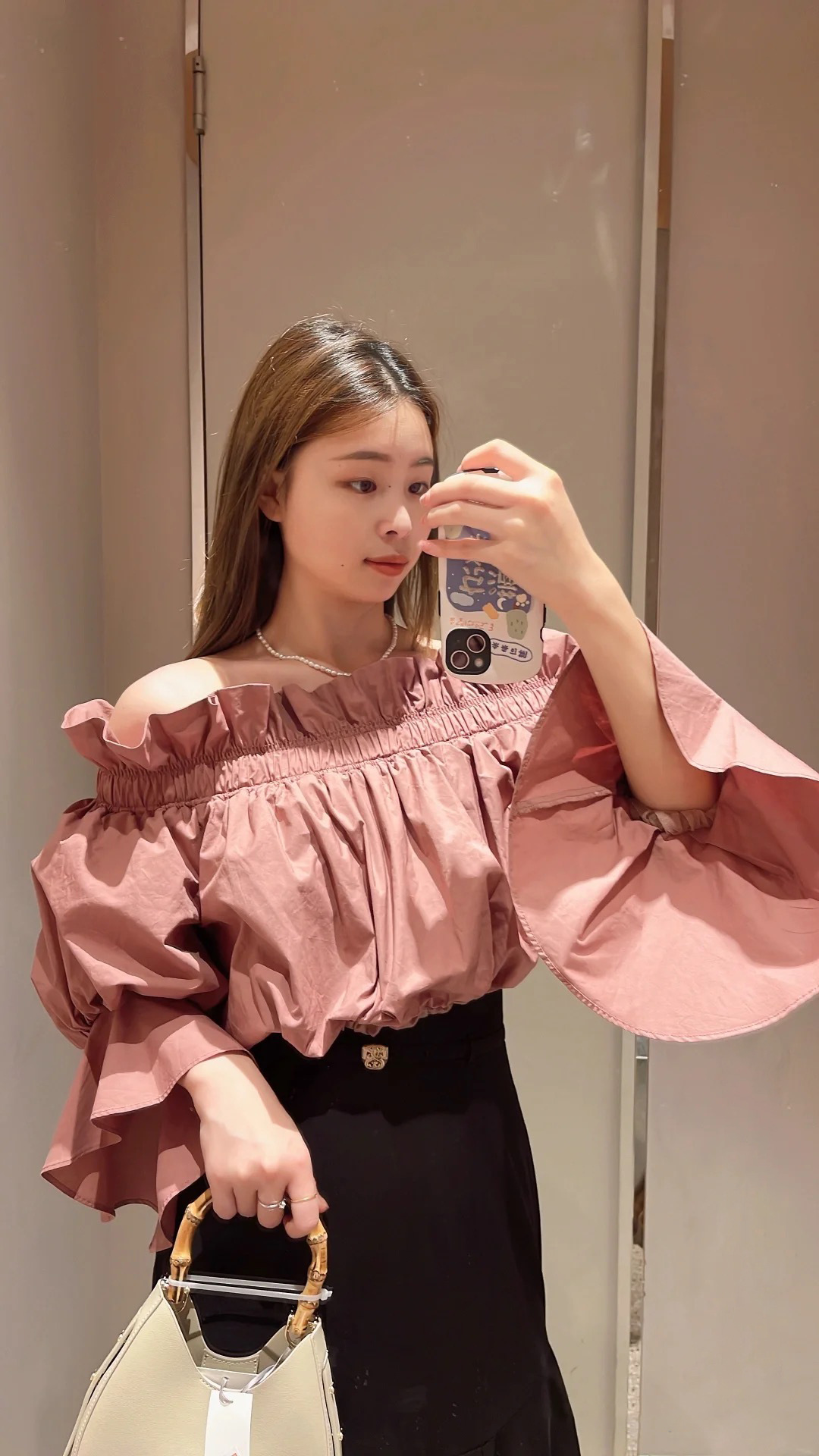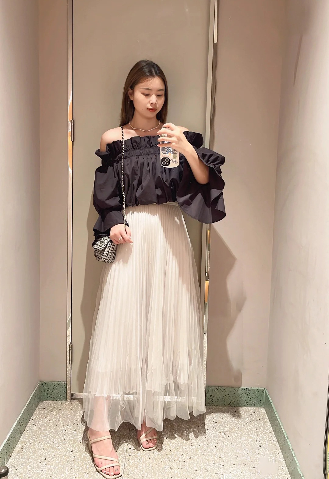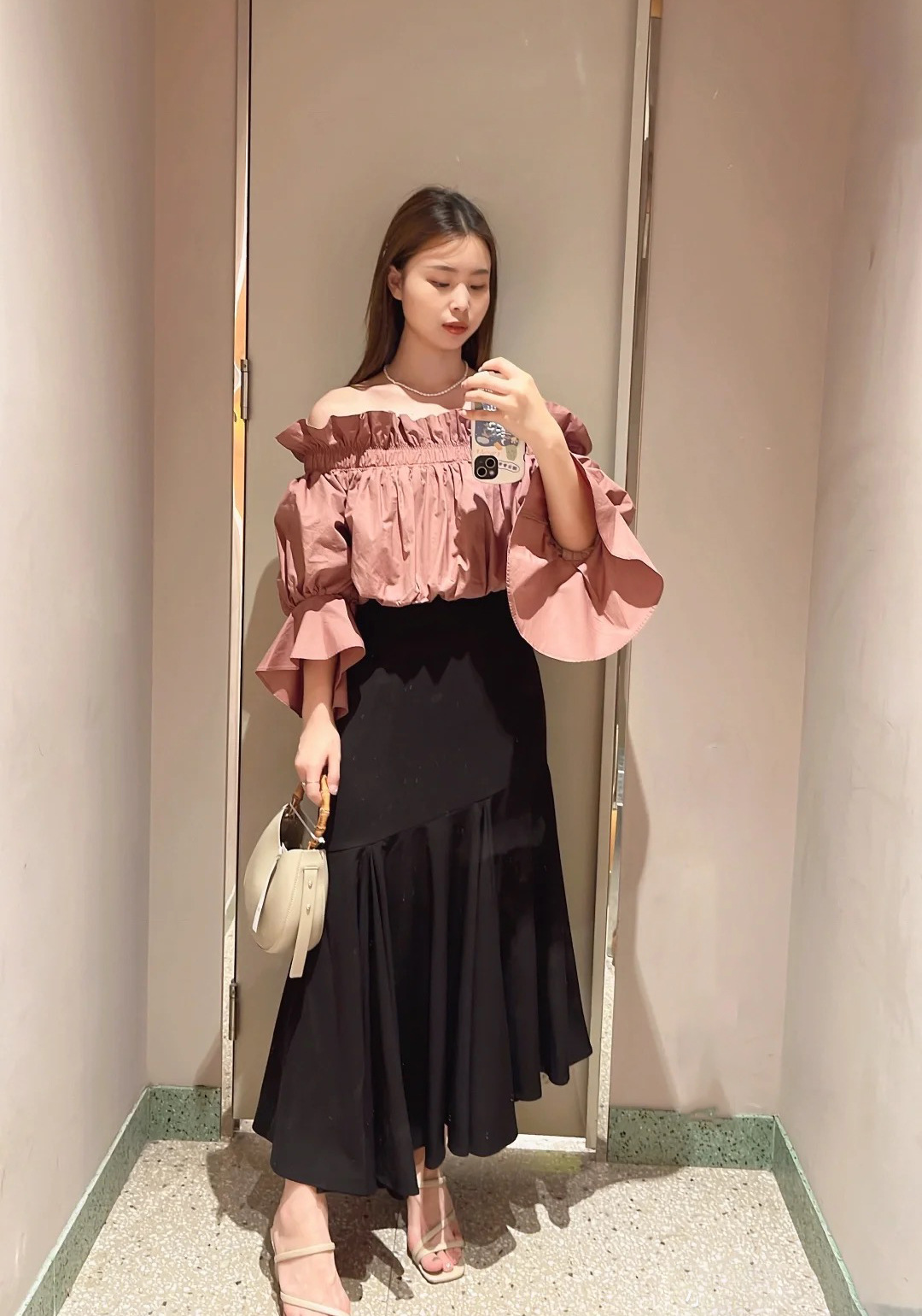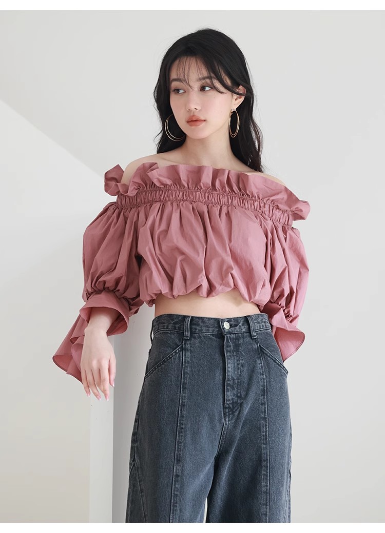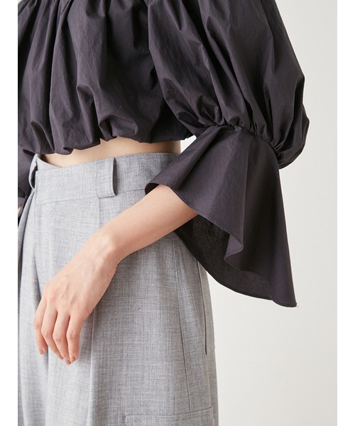 前シーズンに続きトレンド継続中のクロップド丈ブラウス。ふんわりとしたバルーンシルエットの程よいボリューム感がウエスト周りを華奢に見せてくれます。袖のフレアデザインも前後差を付けることにより華やかながらも重たい印象に見えるのを防ぎました。レディライクなアイテムにはもちろん、カジュアルなボトムなどと合わせたMIXスタイルもおすすめです。