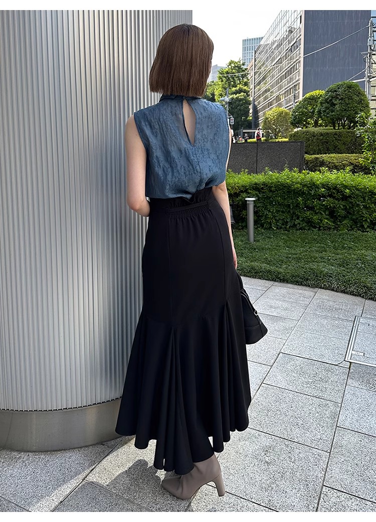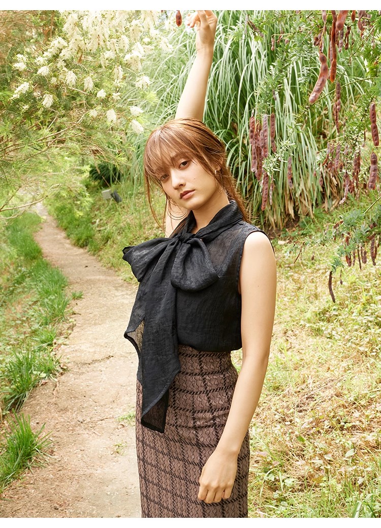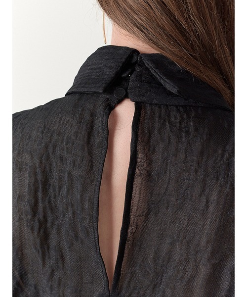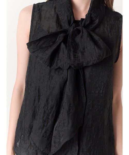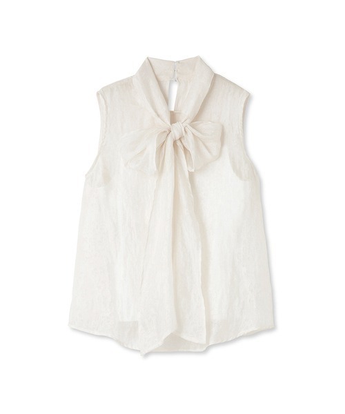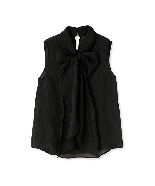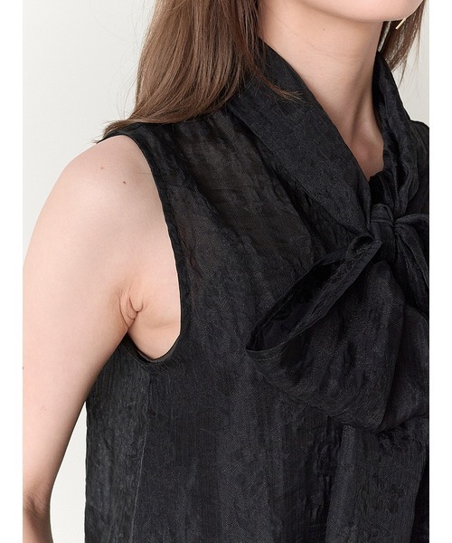 ぽこぽこと表面感のあるジャガード生地で華やかな印象に仕上げたノースリブラウス。抜群の存在感を放つボウタイリボンも相まって、女性らしさを存分に高めてくれる1着です。大ぶりのリボンを引き立てるよう身頃はシンプルなデザインに。パンツともスカートともバランスが取りやすいので、幅広いスタイリングに重宝します。