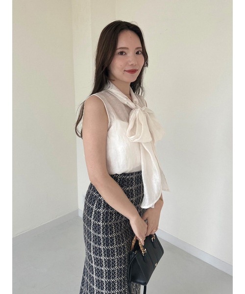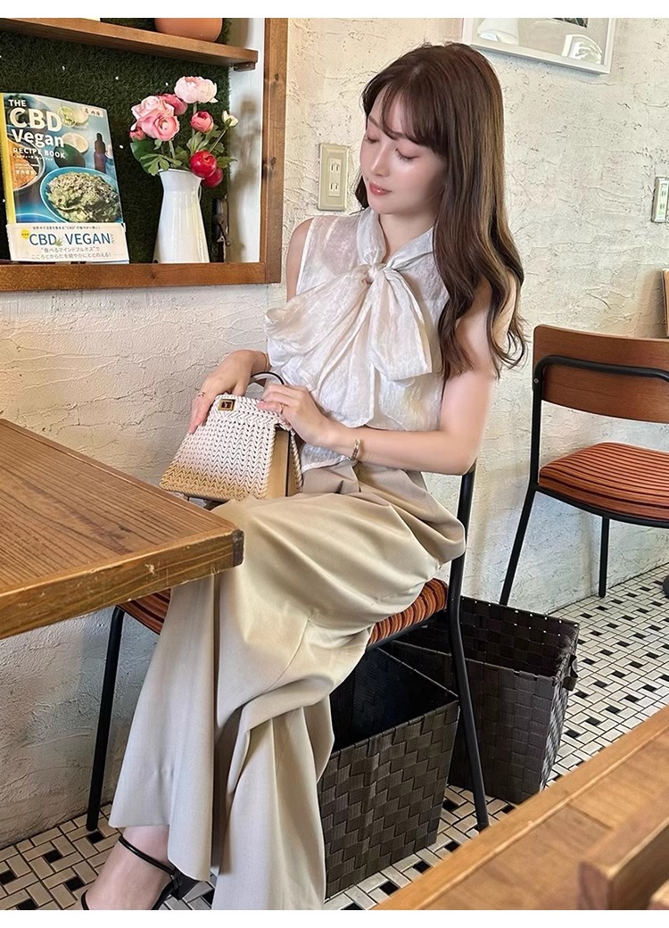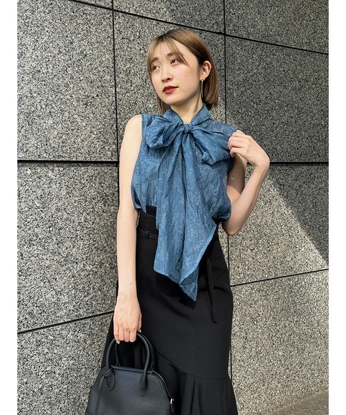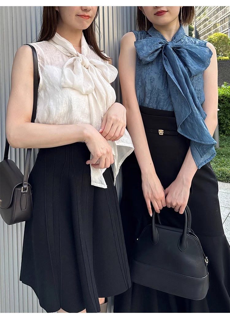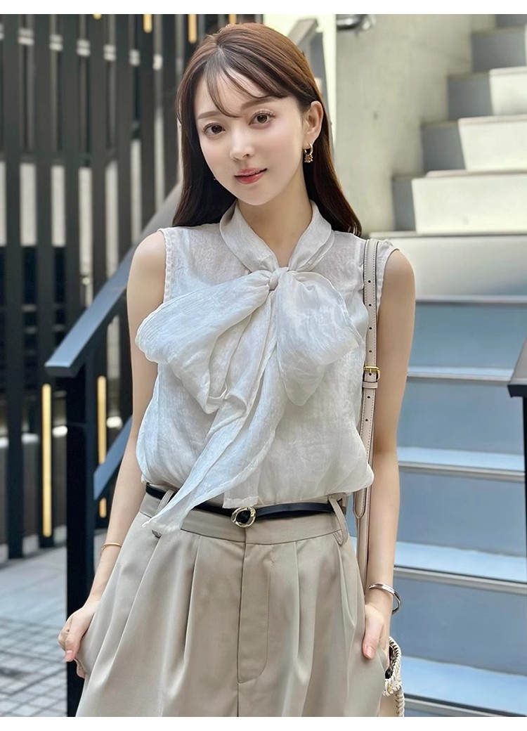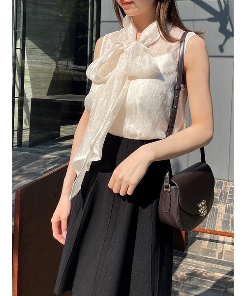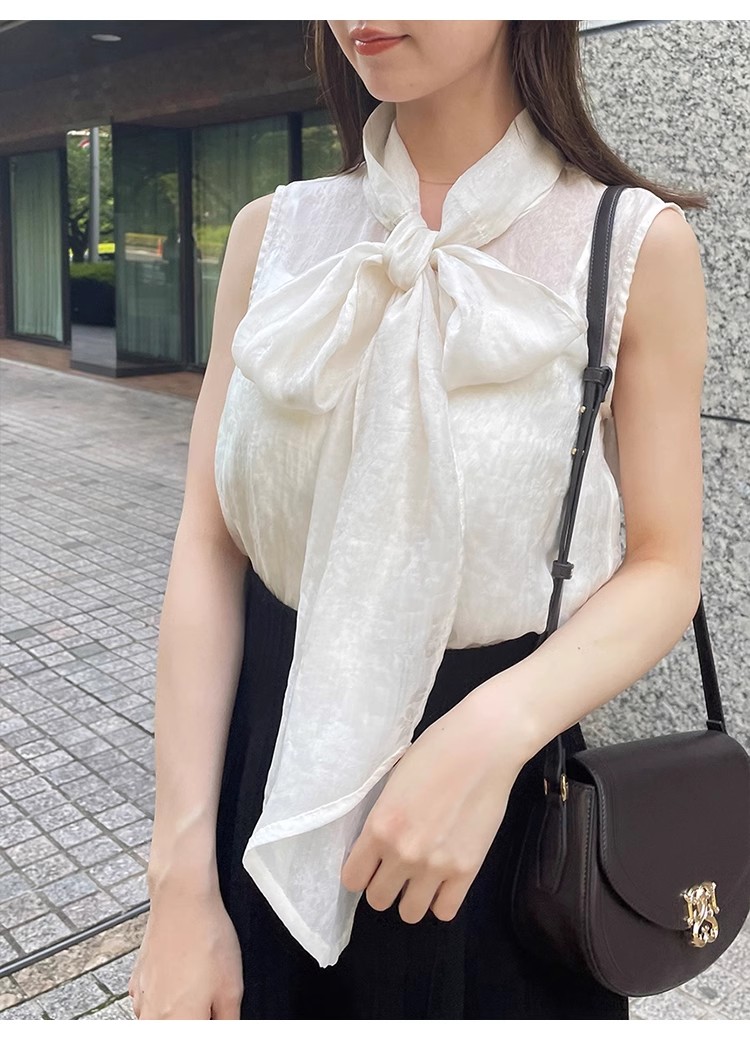 【華やかさと女性らしさを携えたボウタイリボンのノースリブラウス】