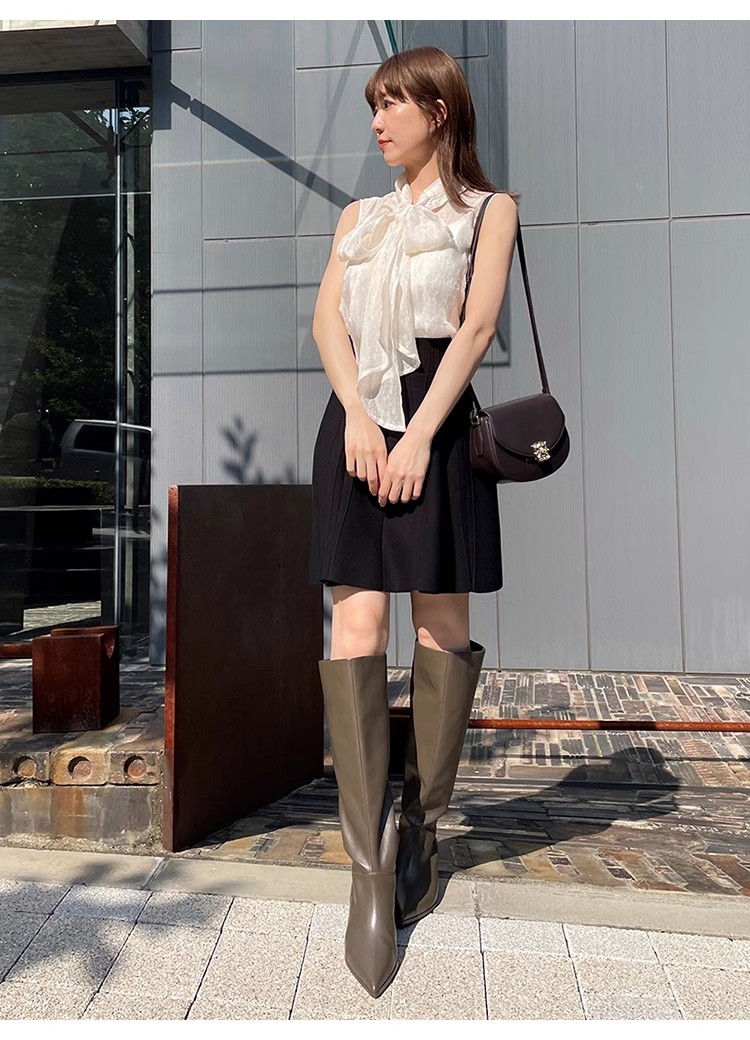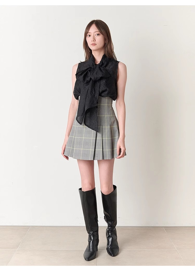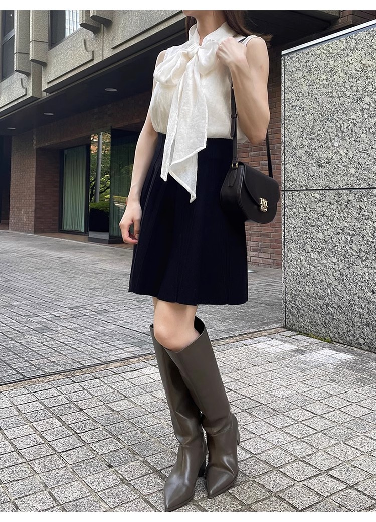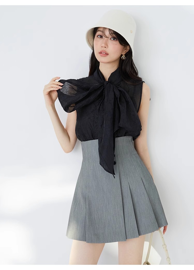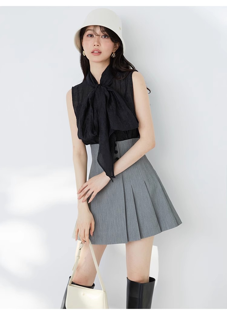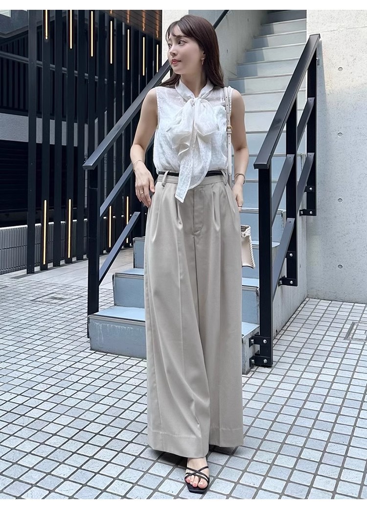 【華やかさと女性らしさを携えたボウタイリボンのノースリブラウス】
