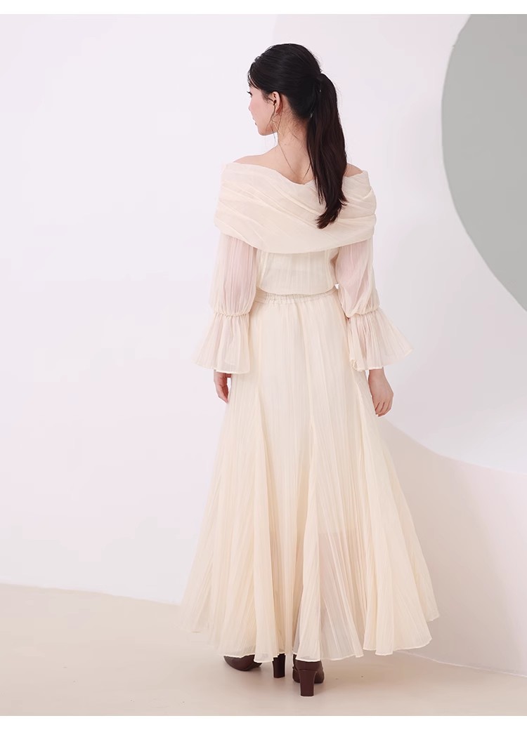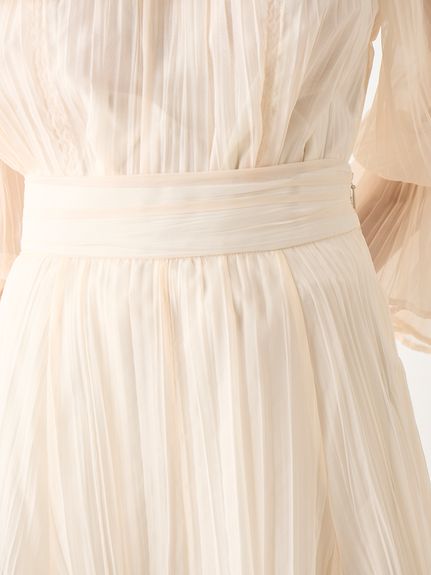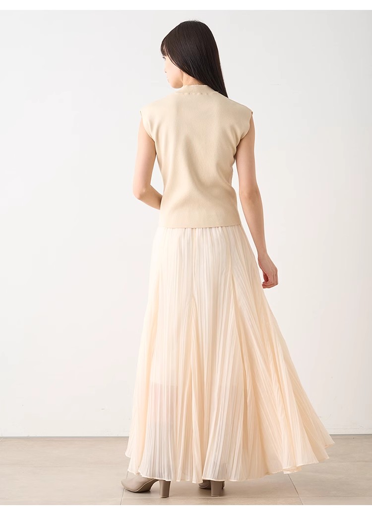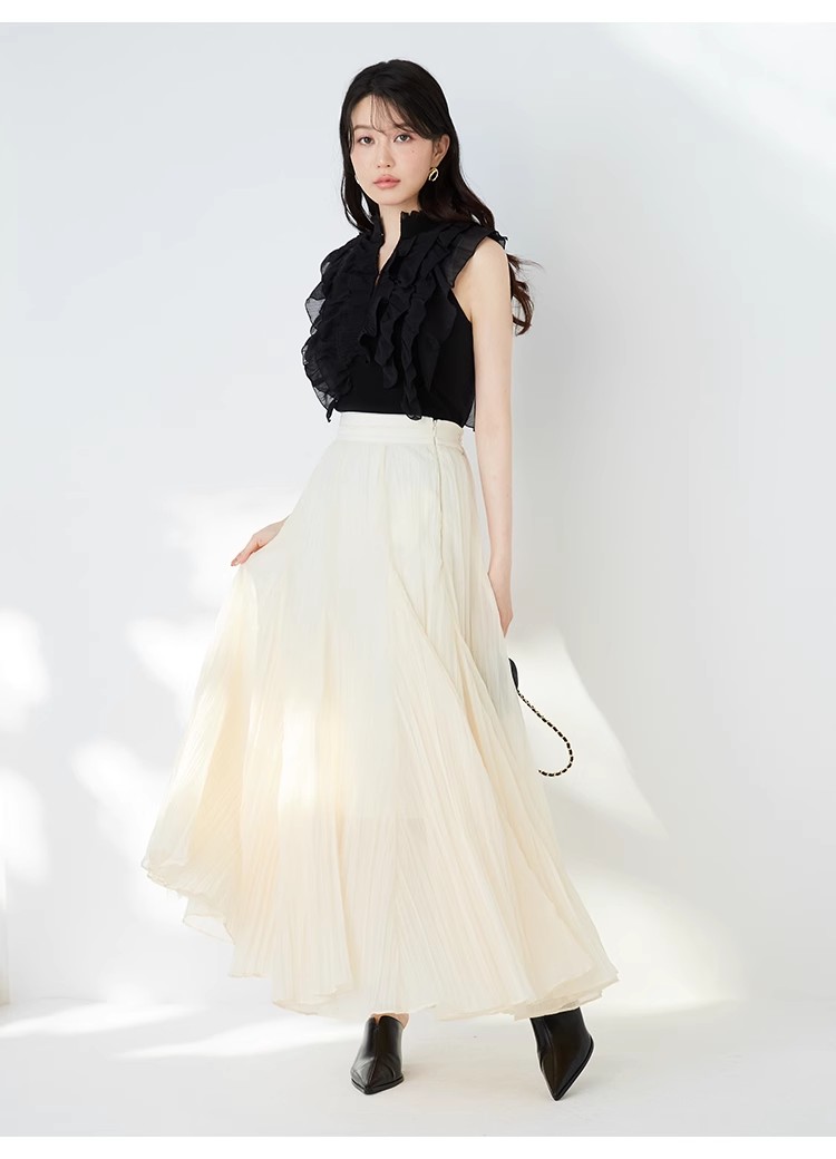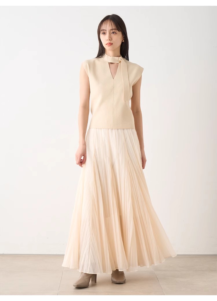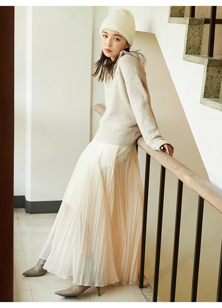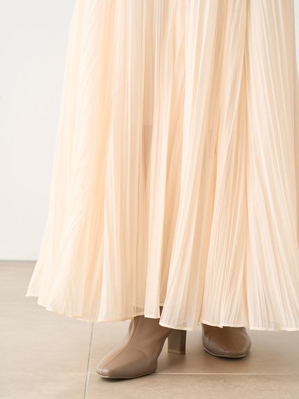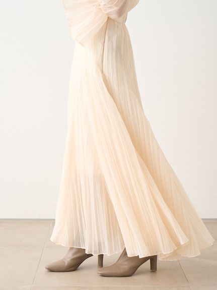 ワッシャー加工と手作業の両方で作られた細かなシワが繊細なシアースカート。たっぷりのボリュームがドラマチックで、女性らしさ引き立つ1着です。バックウエストにはゴムを効かせ、程よいフィット感で穿き心地の良さを考慮。シンプルなトップスを合わせても華やかに決まり、同素材を使用したブラウス(SWFB234154)とセットアップで合わせたワンピース見えのスタイリングもおすすめです。
