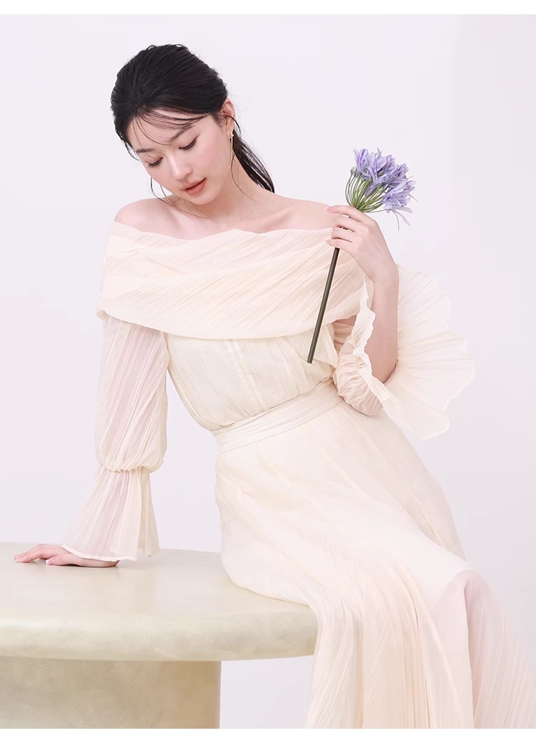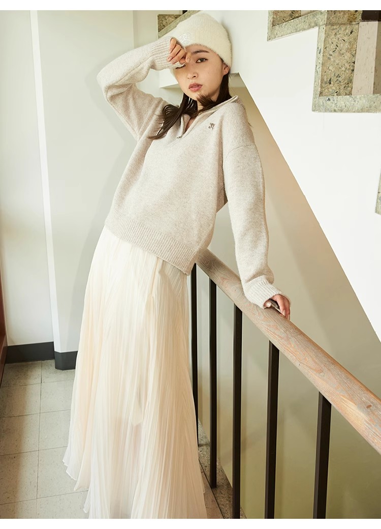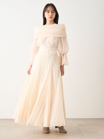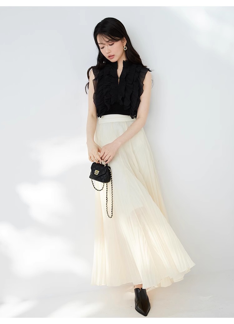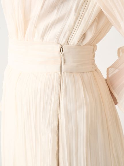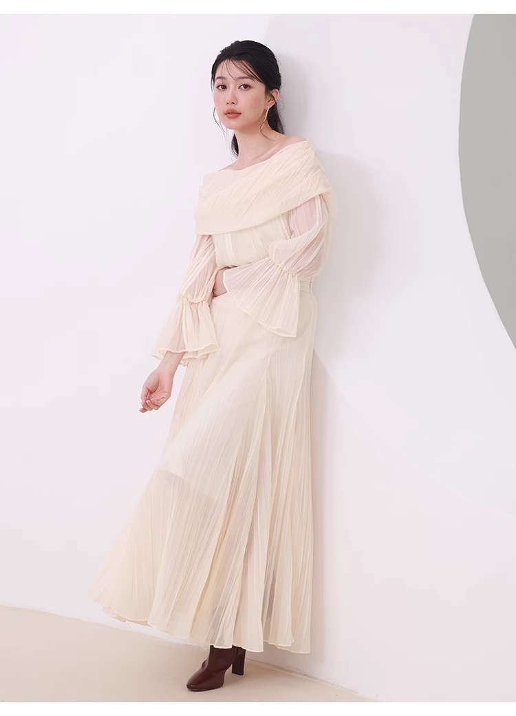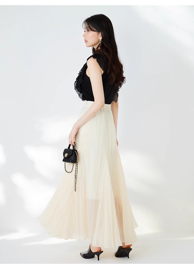 ワッシャー加工と手作業の両方で作られた細かなシワが繊細なシアースカート。たっぷりのボリュームがドラマチックで、女性らしさ引き立つ1着です。バックウエストにはゴムを効かせ、程よいフィット感で穿き心地の良さを考慮。シンプルなトップスを合わせても華やかに決まり、同素材を使用したブラウス(SWFB234154)とセットアップで合わせたワンピース見えのスタイリングもおすすめです。