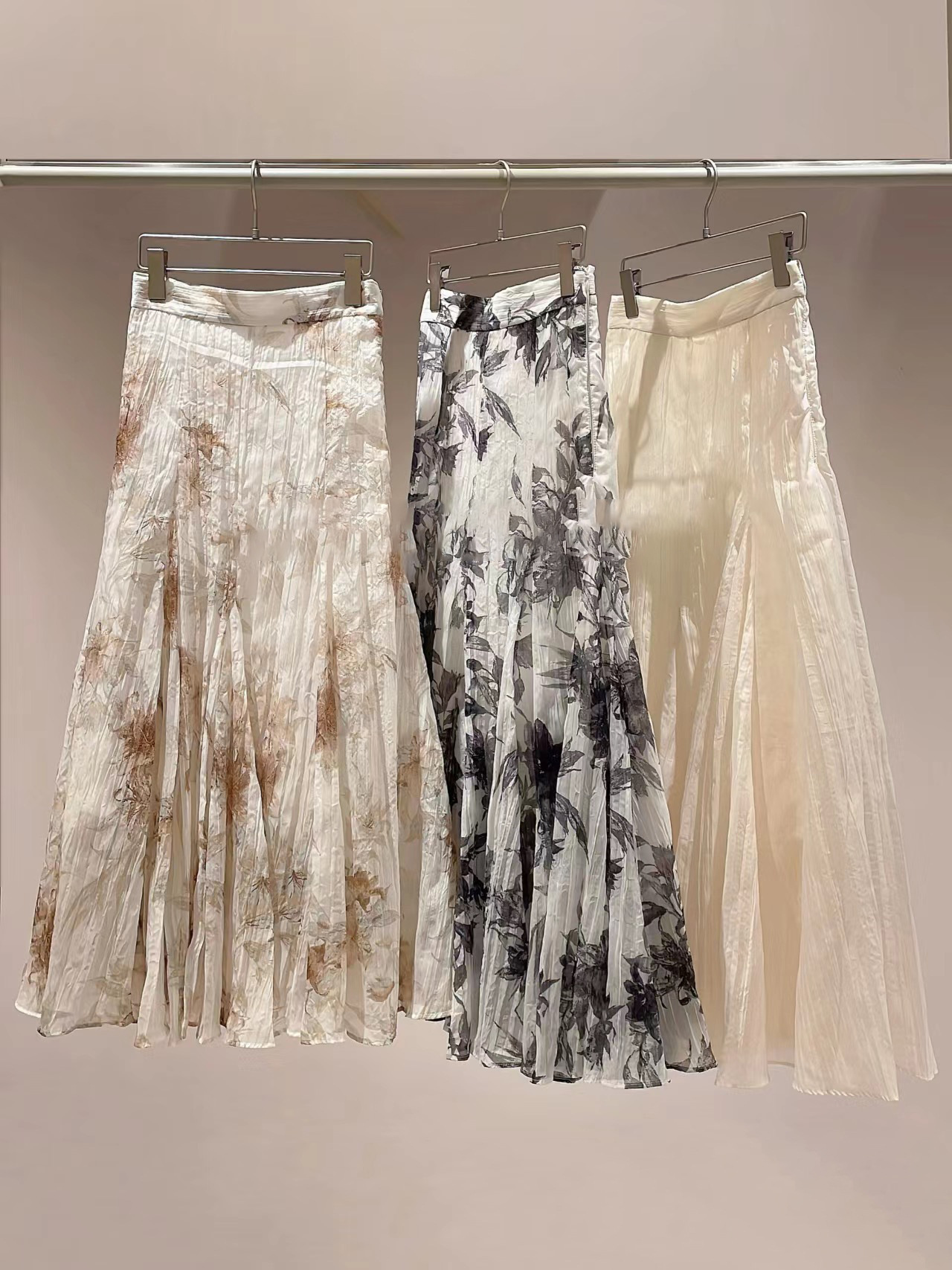 細やかなシワ加工が施されたこだわりのシアー素材を使用。女性らしい淡い色合いのアイボリー、プリントで存在感たっぷりに仕上げたピンクベージュ、ブラックの3色展開でお届けします。