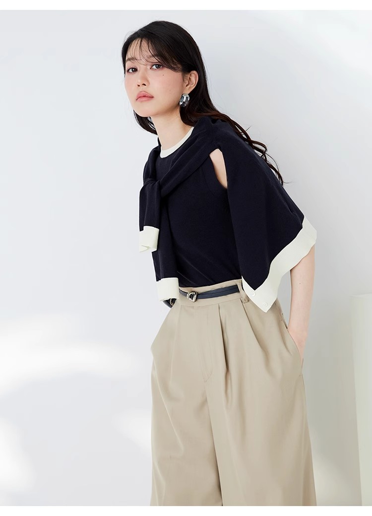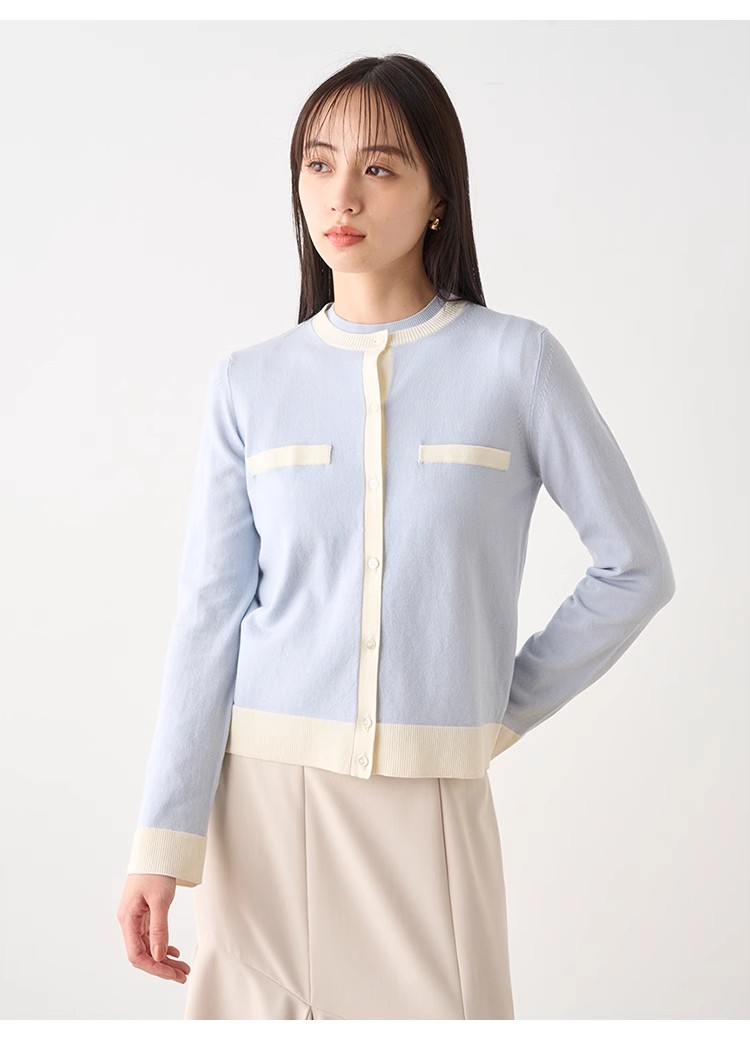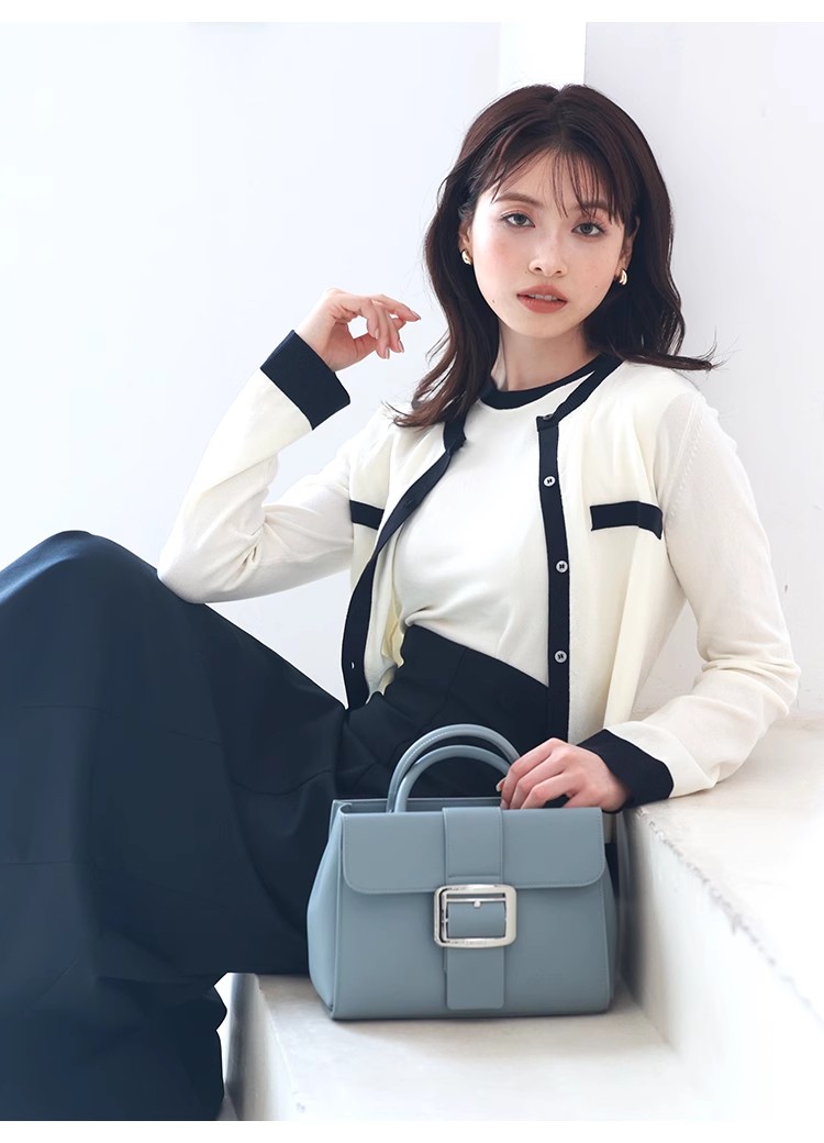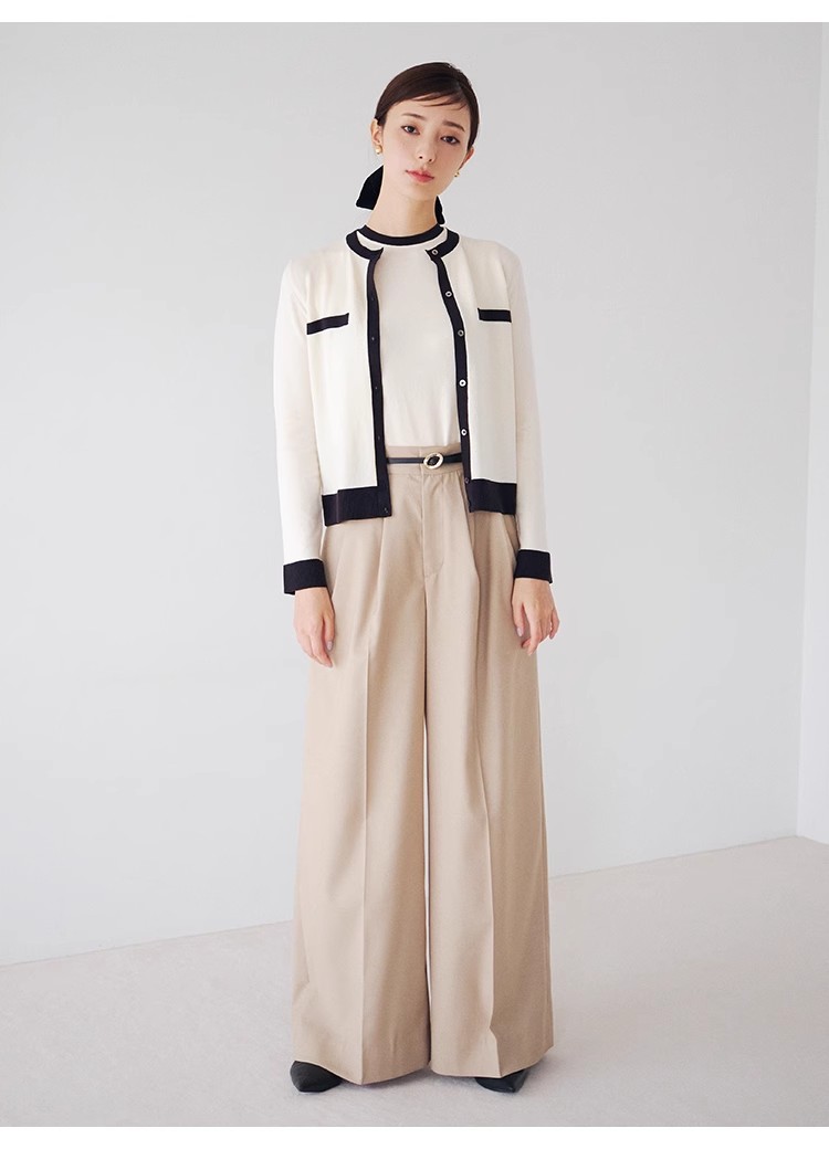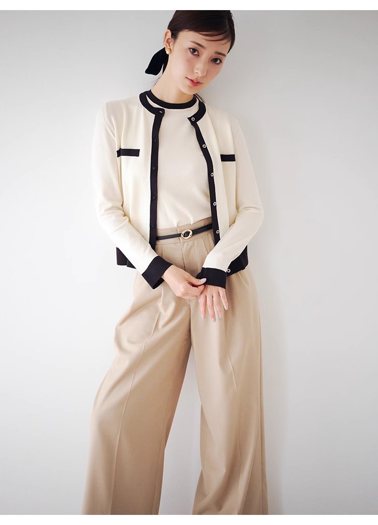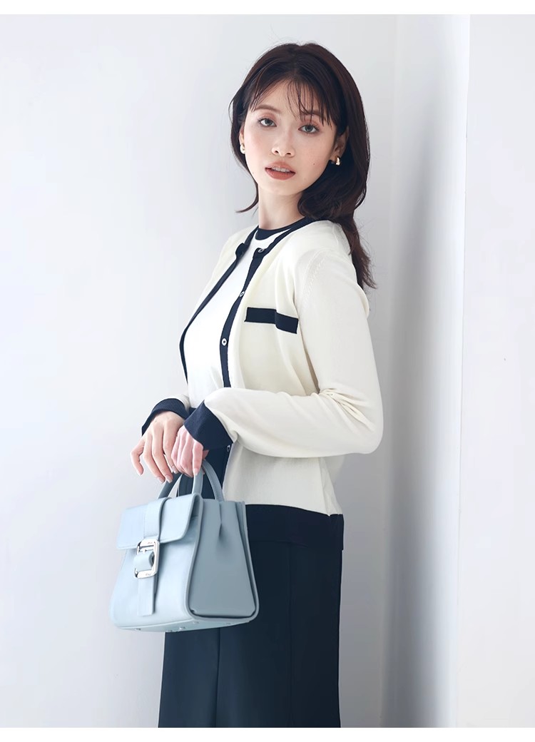 オフィスルックにぴったりな、洗練ムード漂うカーディガンとノースリニットのアンサンブル。バイカラーデザインを落とし込むことでぐっとクラシカルに。カーデはジャケットのように肩掛けしてもバランスが取れるようにスクエアめのフォルムに仕立てました。それぞれ単品でも着用できるので、コーディネートの幅が一気に広がります。