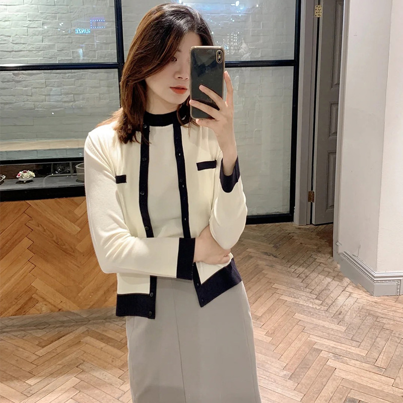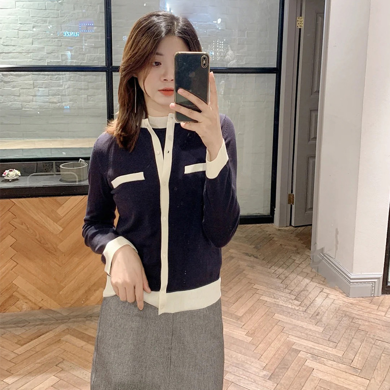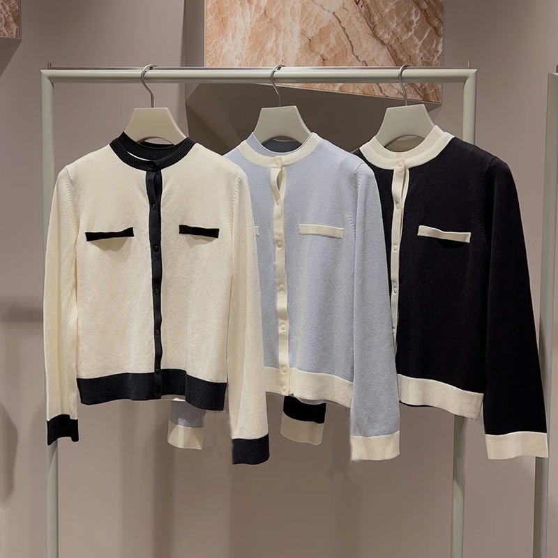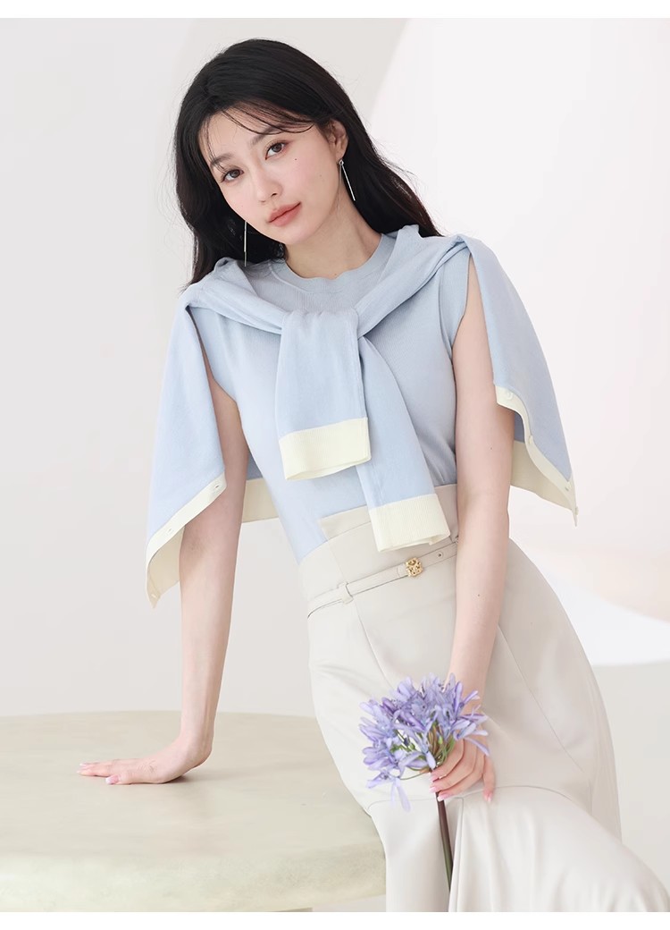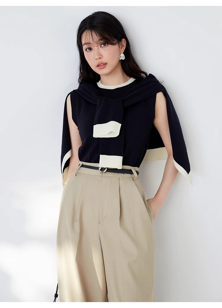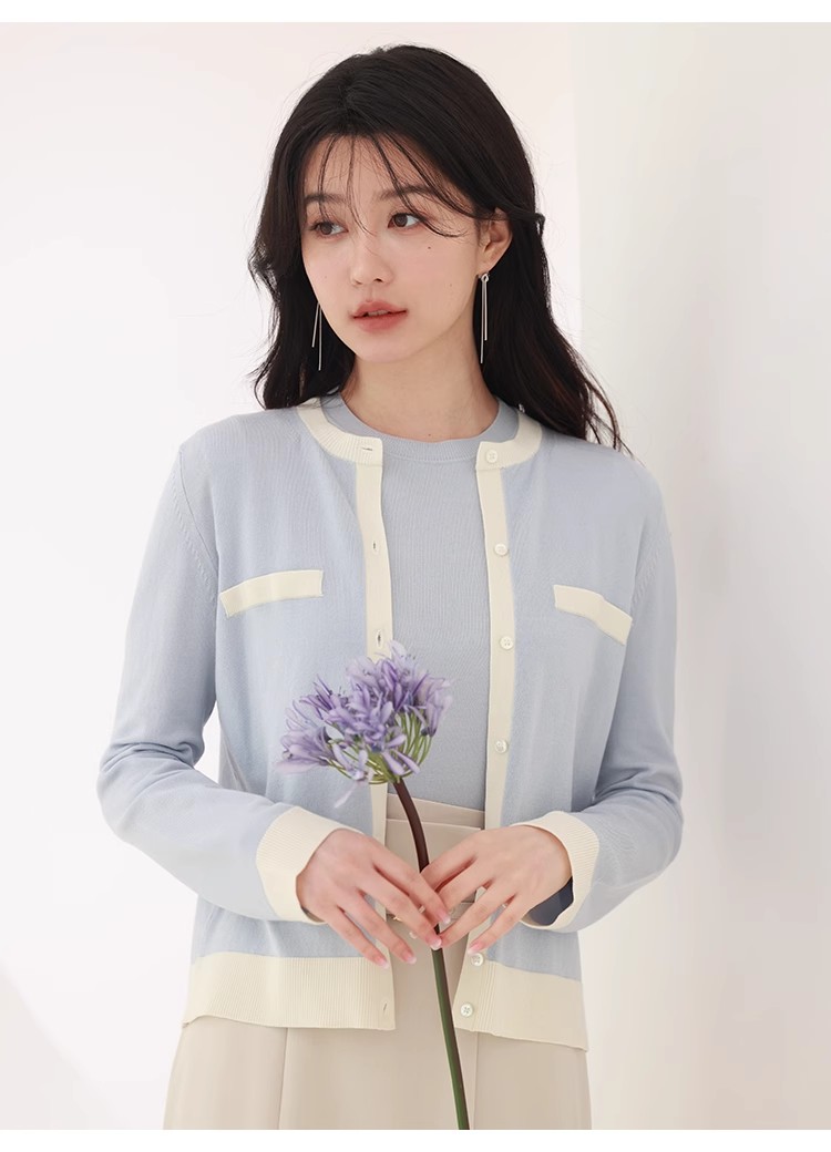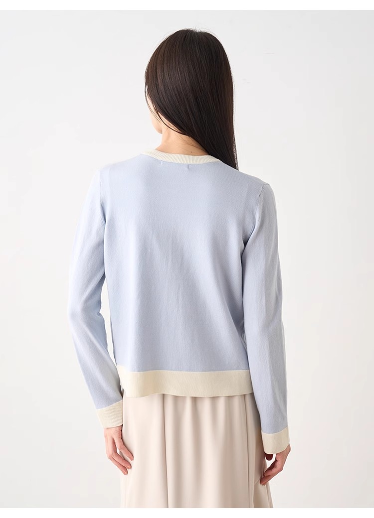 オフィスルックにぴったりな、洗練ムード漂うカーディガンとノースリニットのアンサンブル。バイカラーデザインを落とし込むことでぐっとクラシカルに。カーデはジャケットのように肩掛けしてもバランスが取れるようにスクエアめのフォルムに仕立てました。それぞれ単品でも着用できるので、コーディネートの幅が一気に広がります。