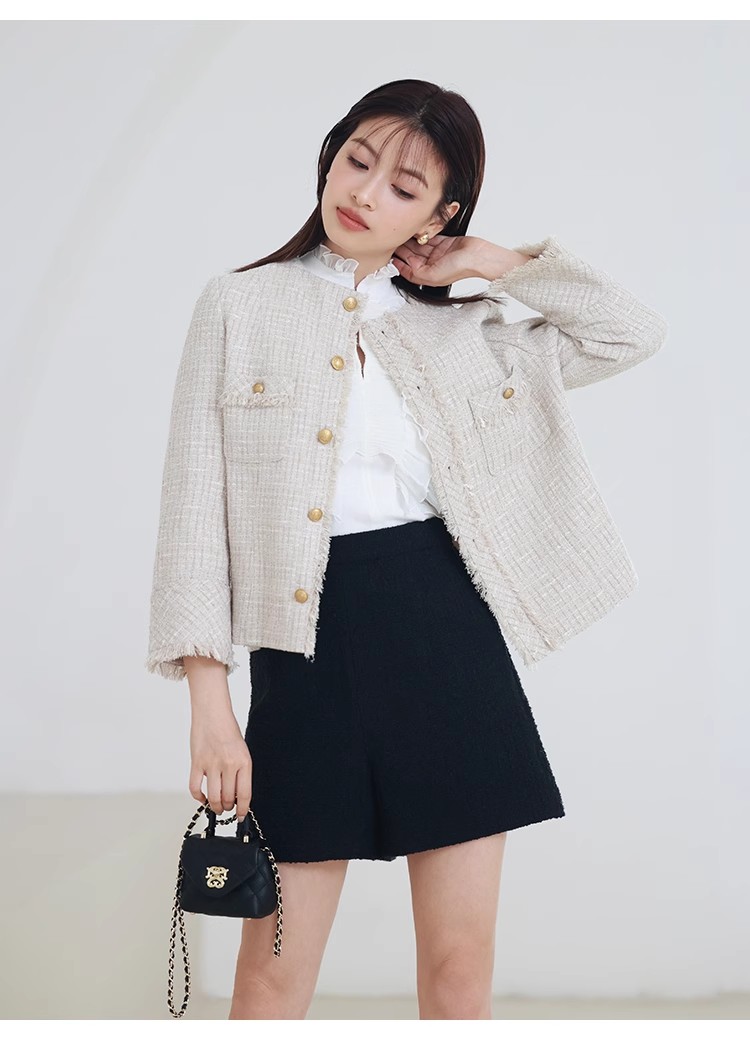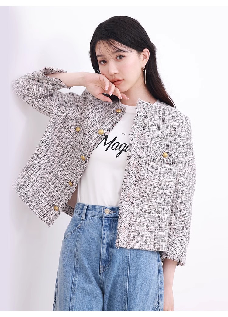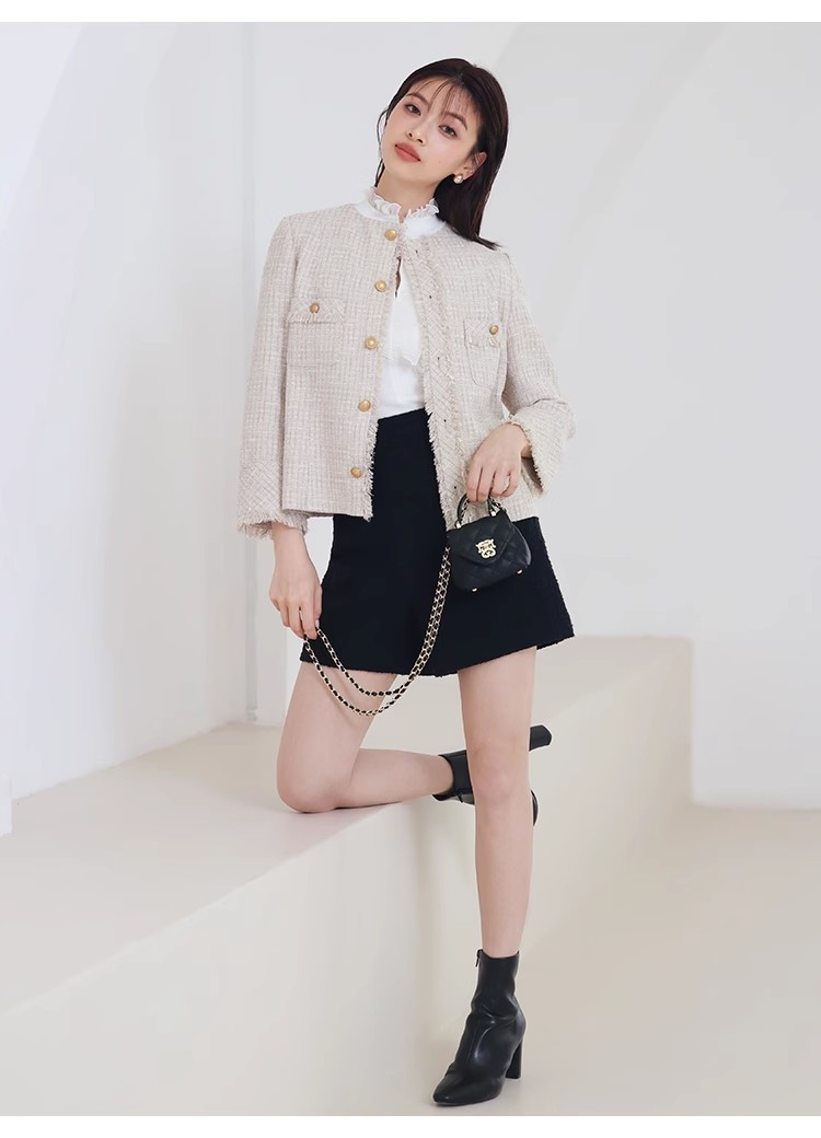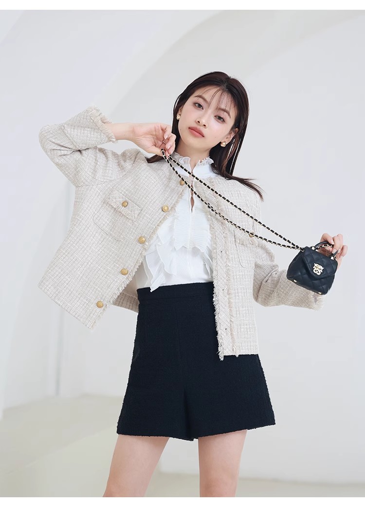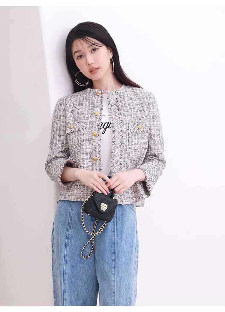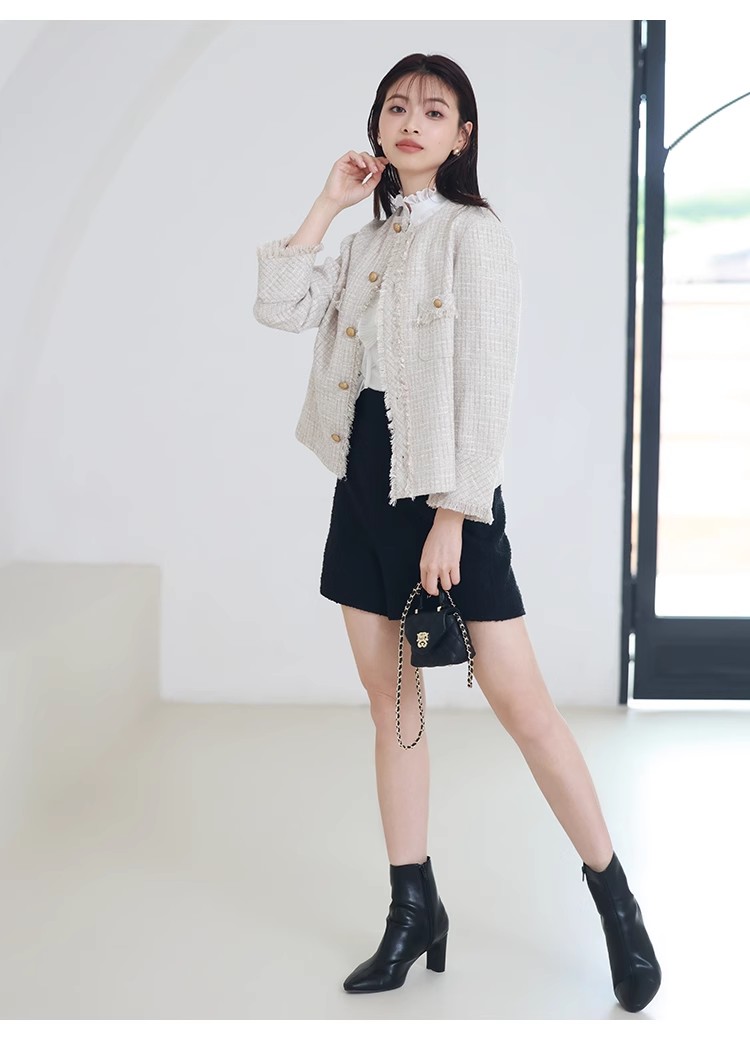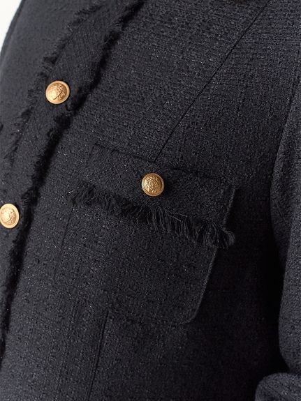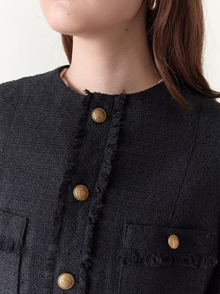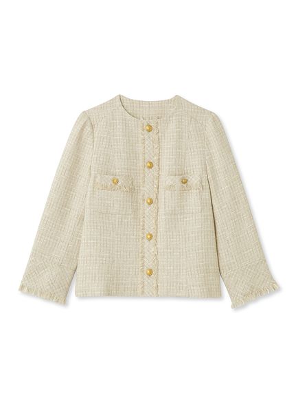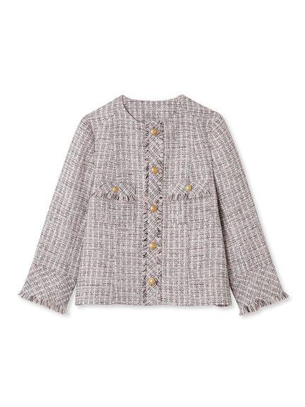 様々なシーンで活躍するクラシックなツイードジャケット。細部にフリンジを使うことで華やかさをプラス。色ごとに異なる素材を使用し、バリエーションでご用意いたしました。すっきりとしたシンプルなシルエットが好印象。パンツともスカートとも、ワンピースなどにも合わせやすく、幅広いスタイリングに重宝します。