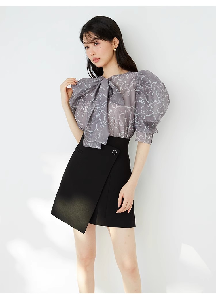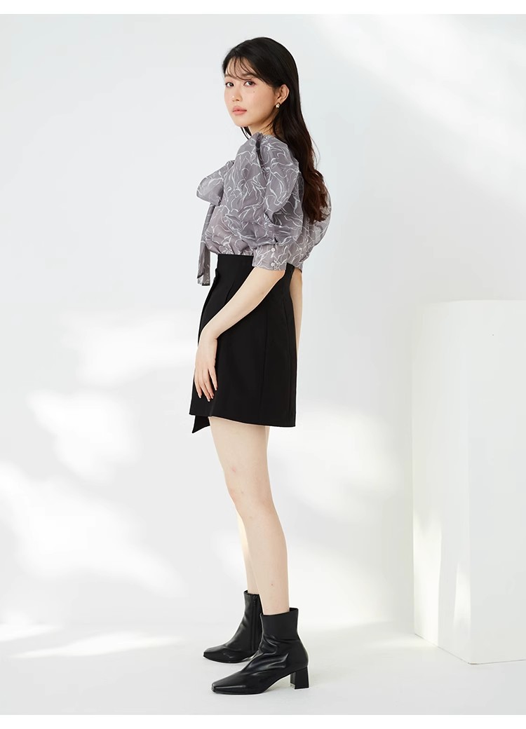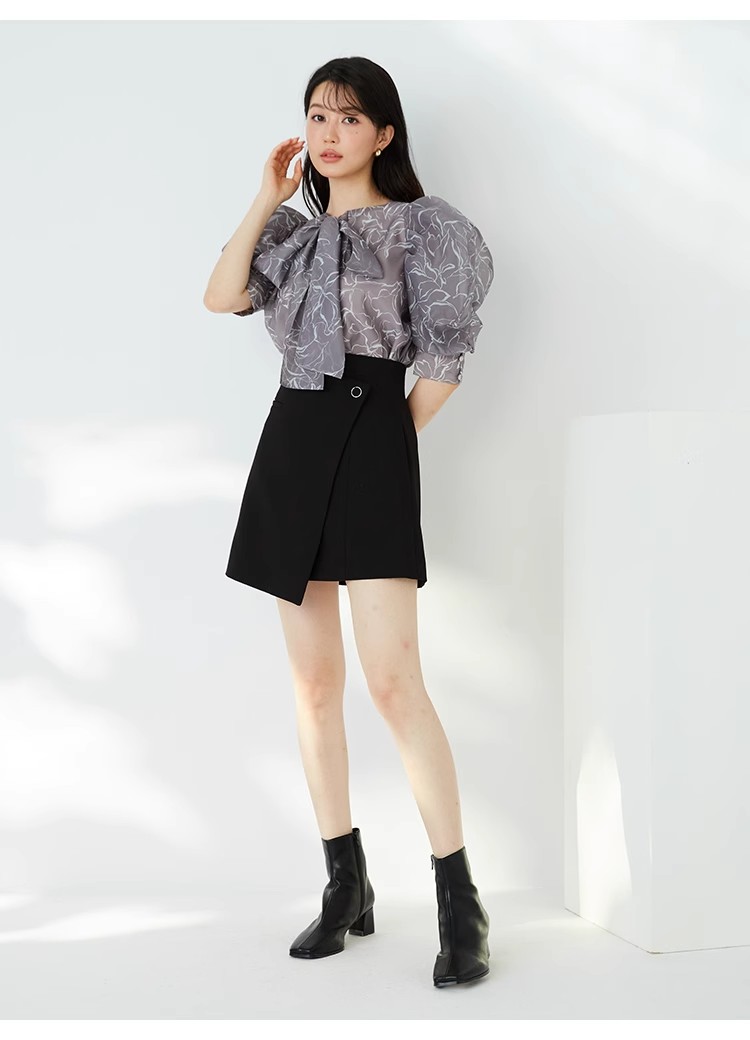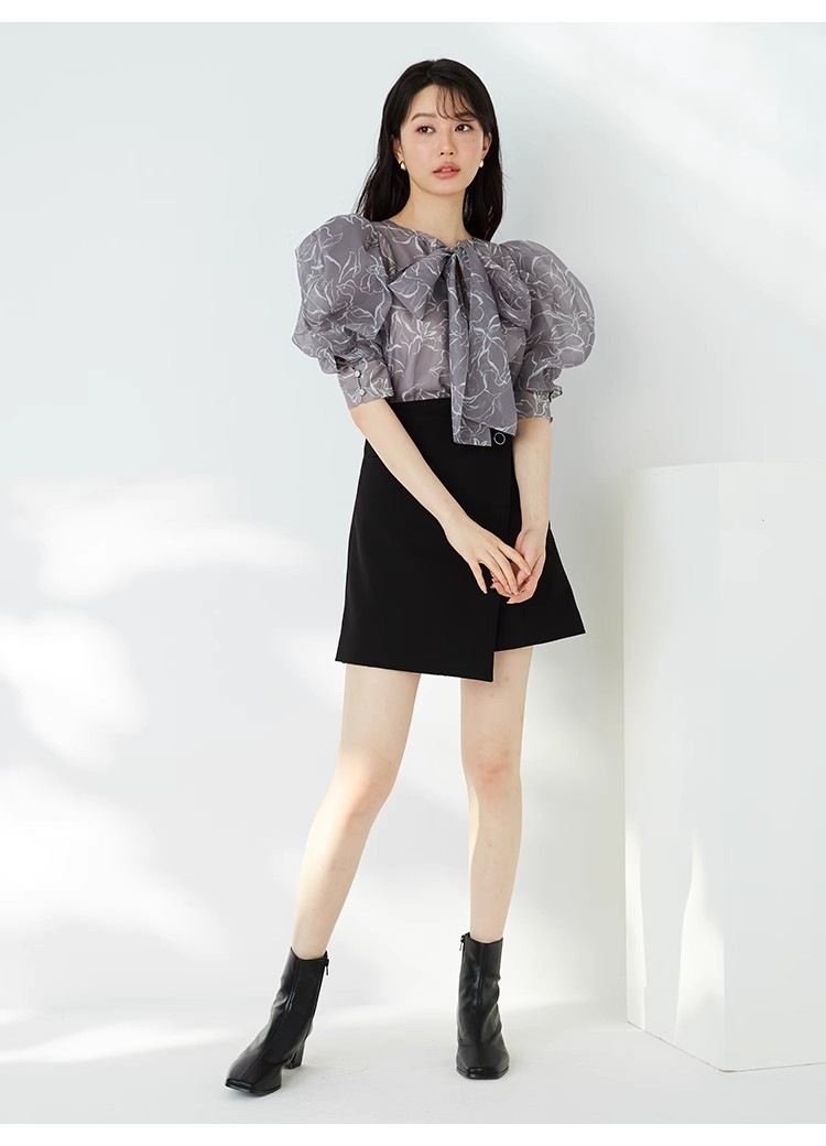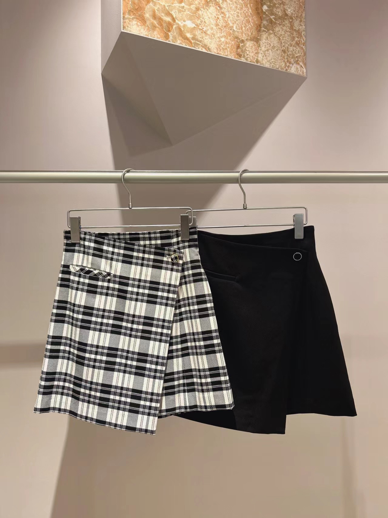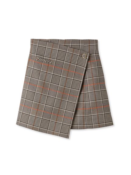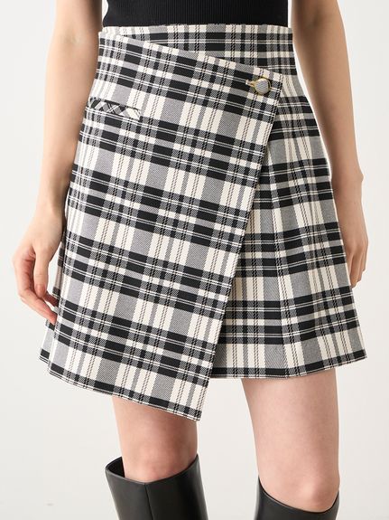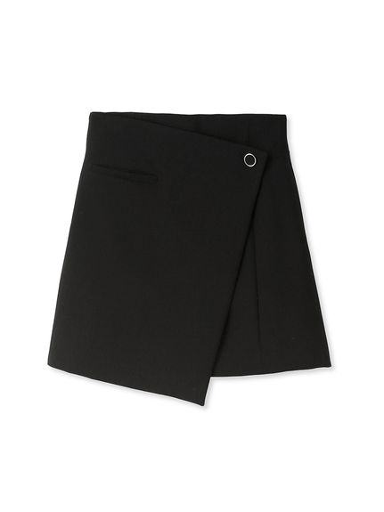 ラップスカートにように見えるフロントデザインが特徴的なミニスカート。斜めに重ね合わせたラップ風のデザインながら、しっかりと脇まで生地があるので安心して着用いただけます。タイトなハイウエスト仕様でスタイルアップ効果抜群。合わせるトップスを選ばず幅広いコーデに活躍する万能アイテムです。