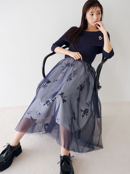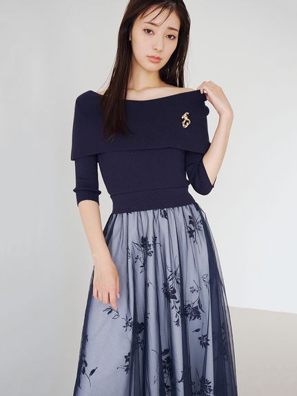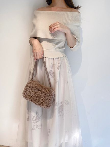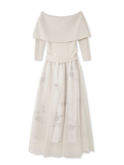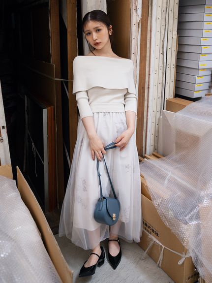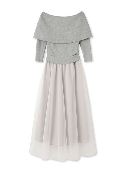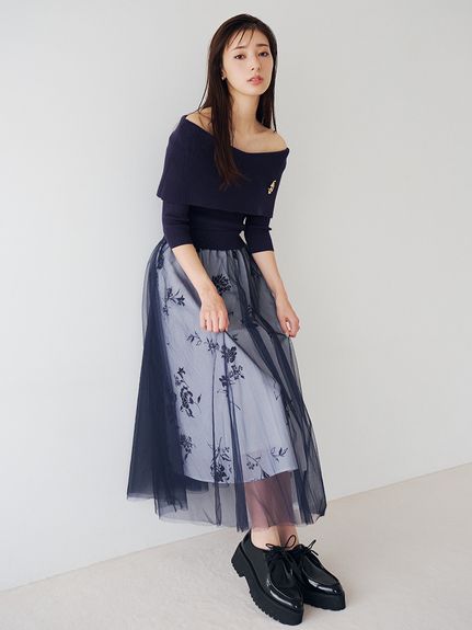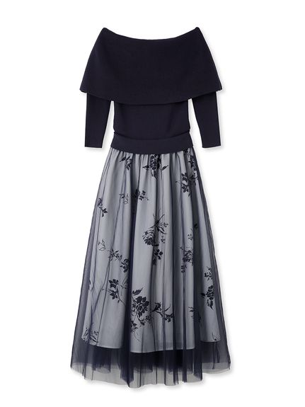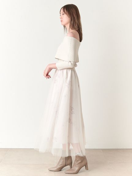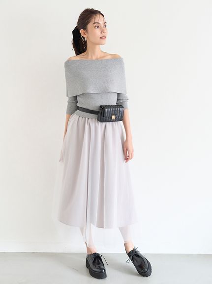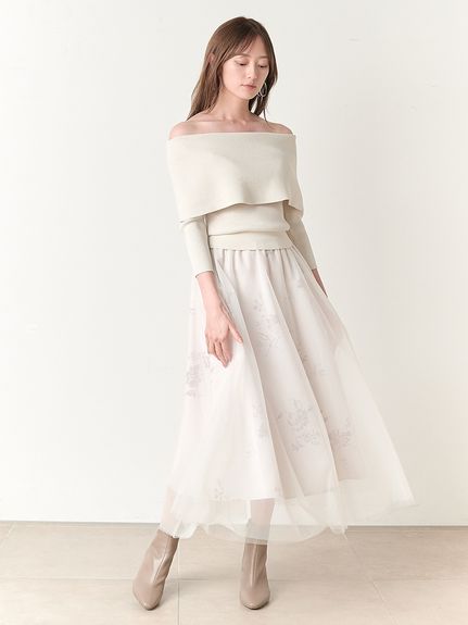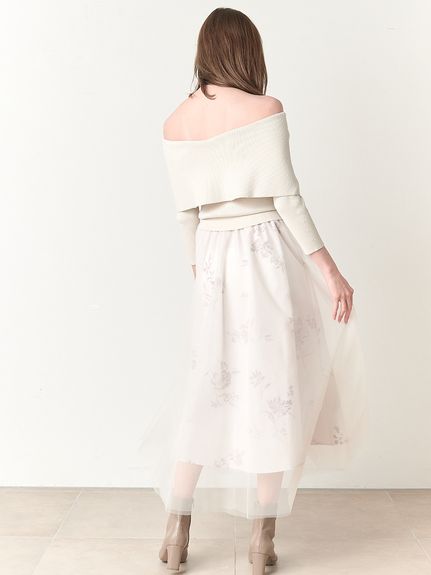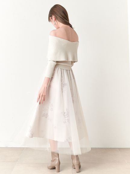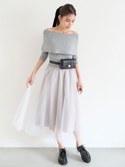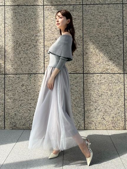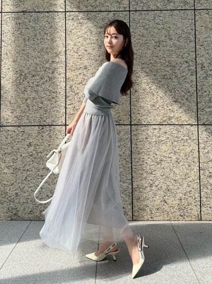 デコルテをキレイに魅せるオフショルデザイントップにチュールスカートを組み合わせた、レディムード高まるコンビネーションワンピース。