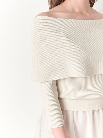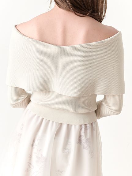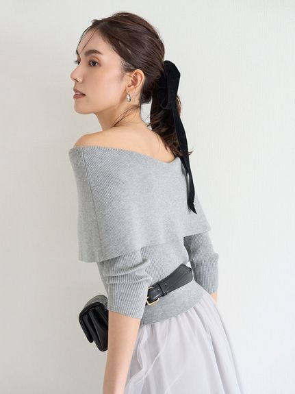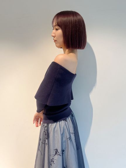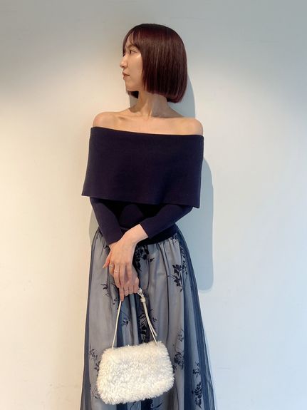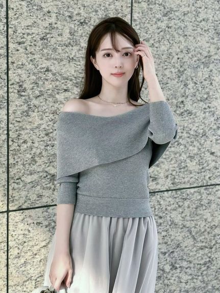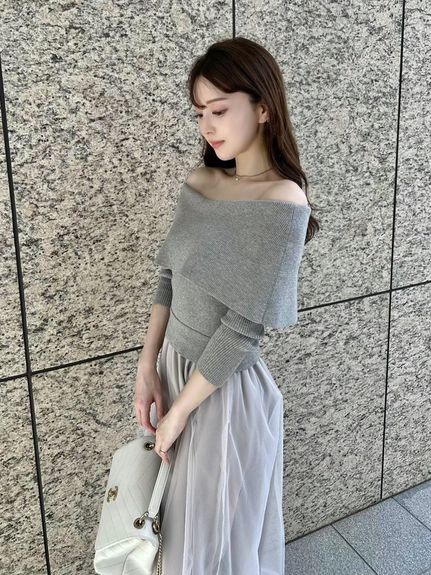 ニットは肌あたりのいいレーヨンベースのミドルゲージで程よく肉感があり、ワイドな折り返しのオフショルがケープっぽく今期らしいポイントです。