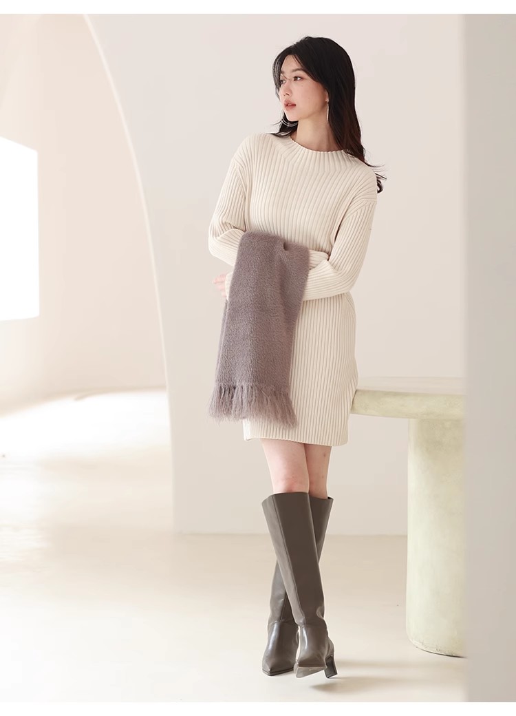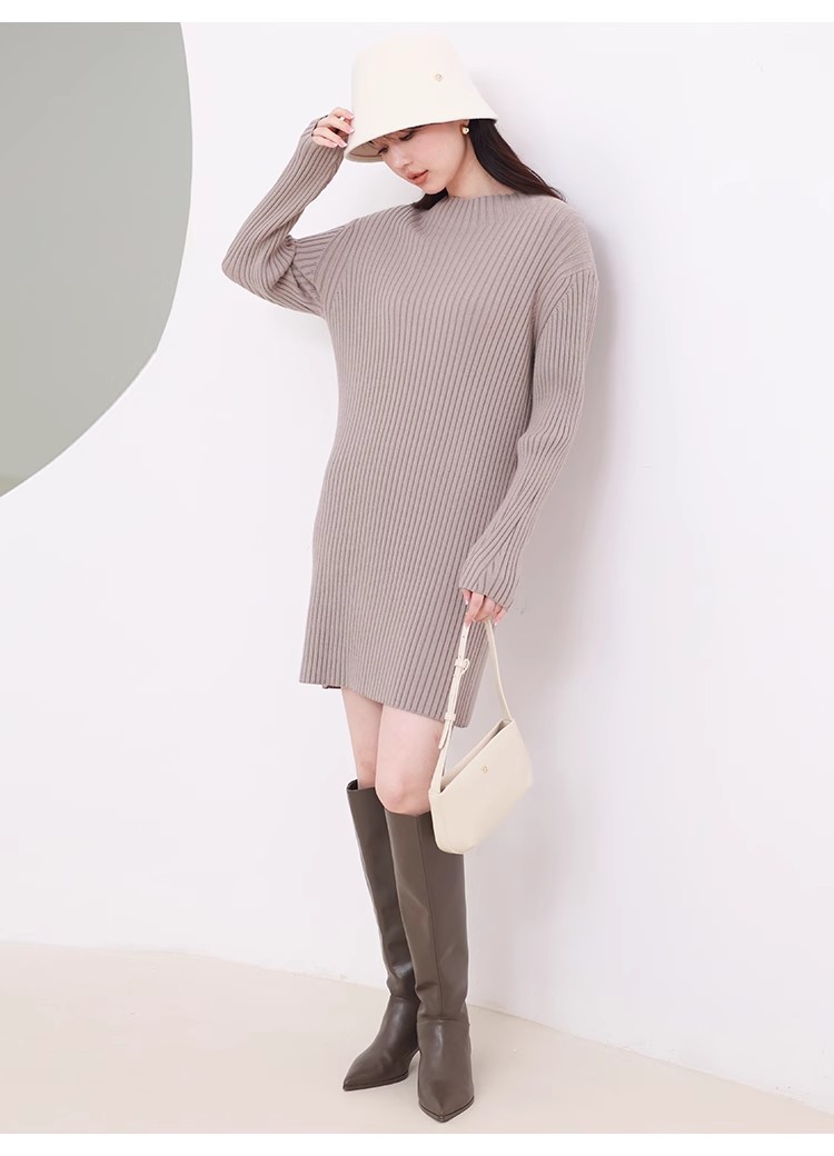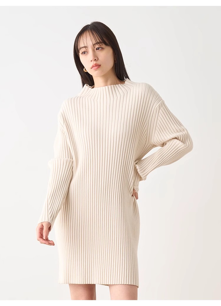 ピッタリしすぎないようにシルエットにこだわったニットミニワンピース。タイト過ぎないながらも野暮ったく見えないようにバランス良く仕上げました。ワイドなリブ模様が縦のラインを強調し、スタイルアップへと導いてくれます。ロングブーツに合わせてコーディネートするのがおすすめ。