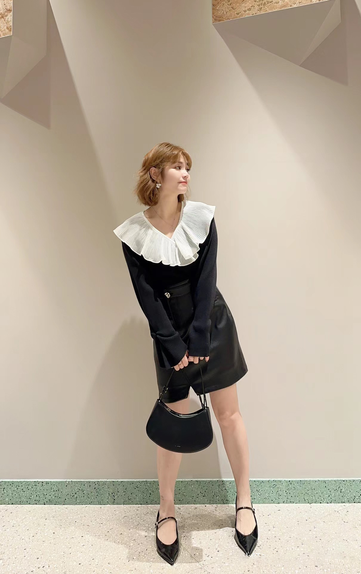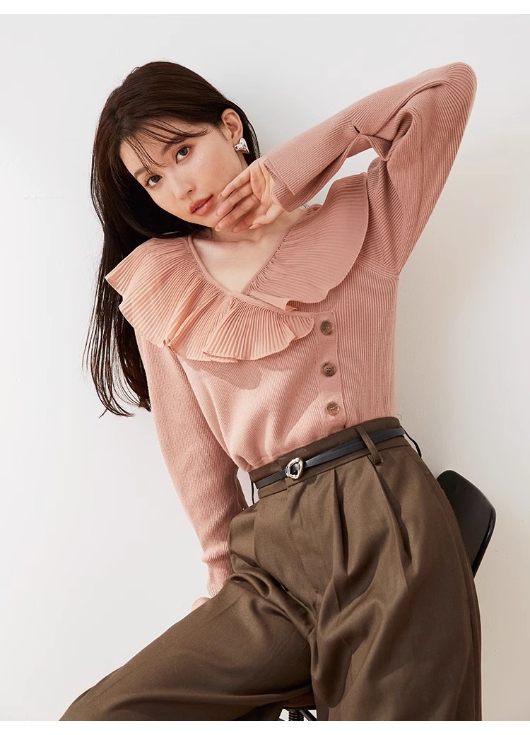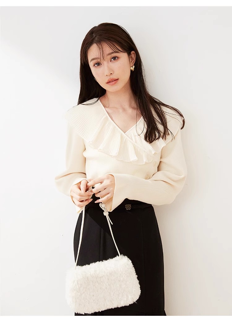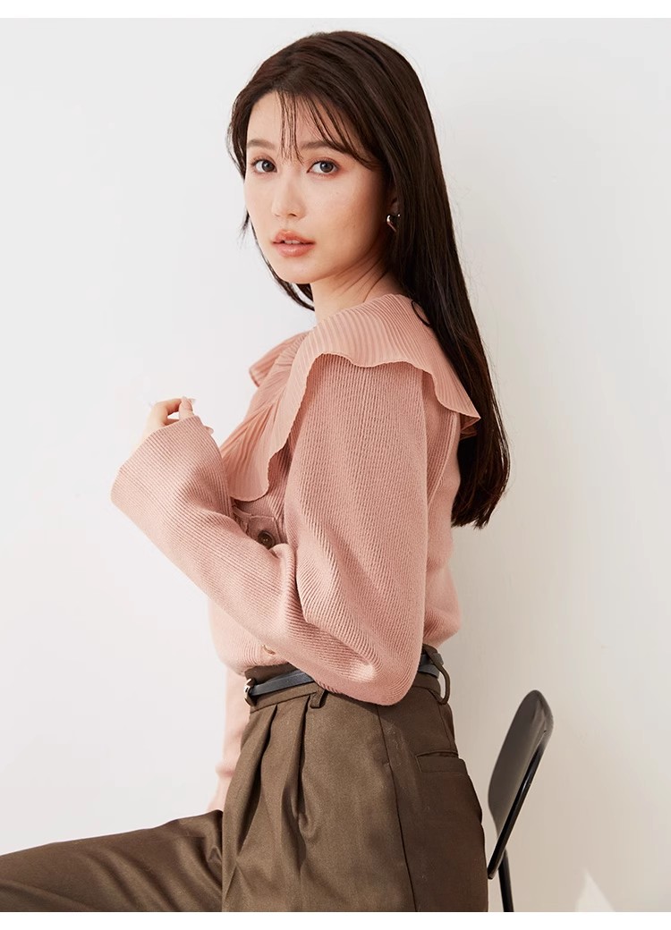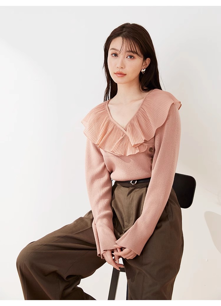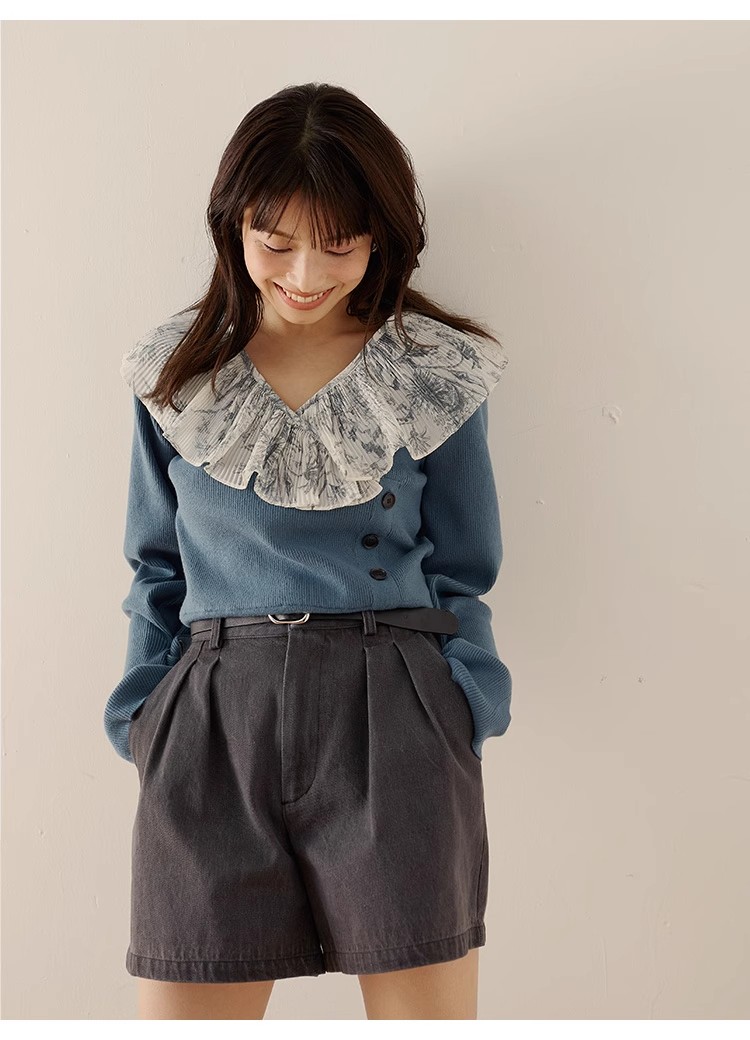 エアリーなシフォンの襟がドッキングされた、クラシカルレディなニットプルオーバー。シフォンカラーには細かいプリーツを畳み、ボリュームがありながらも軽く見えるように工夫しました。袖と身頃にはボタンをあしらい細部のディテールにもこだわった1着。すっきりとしたシルエットなので合わせるボトムを選ばず、幅広いコーディネートに取り入れられます。