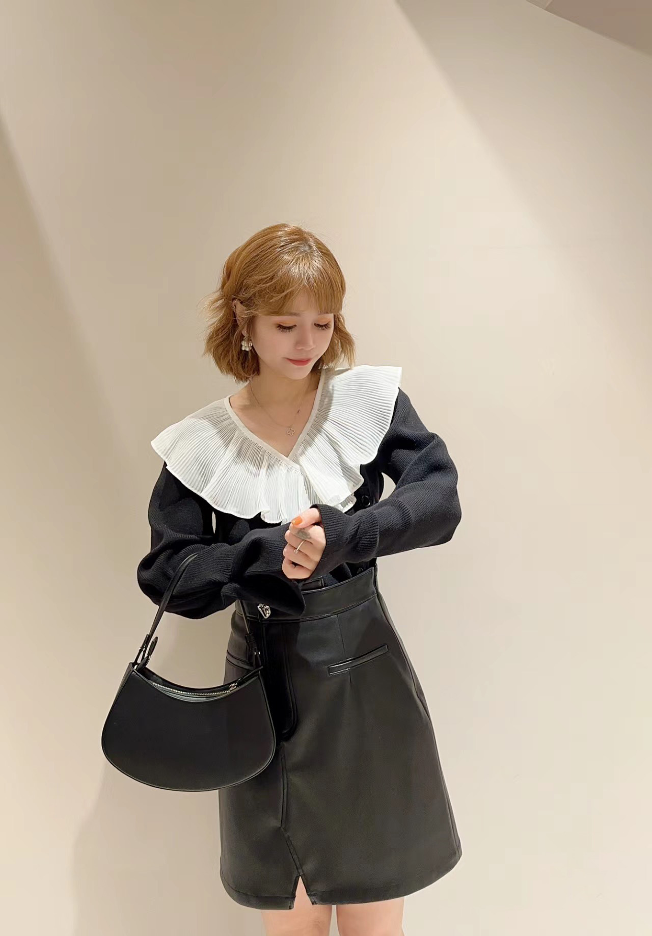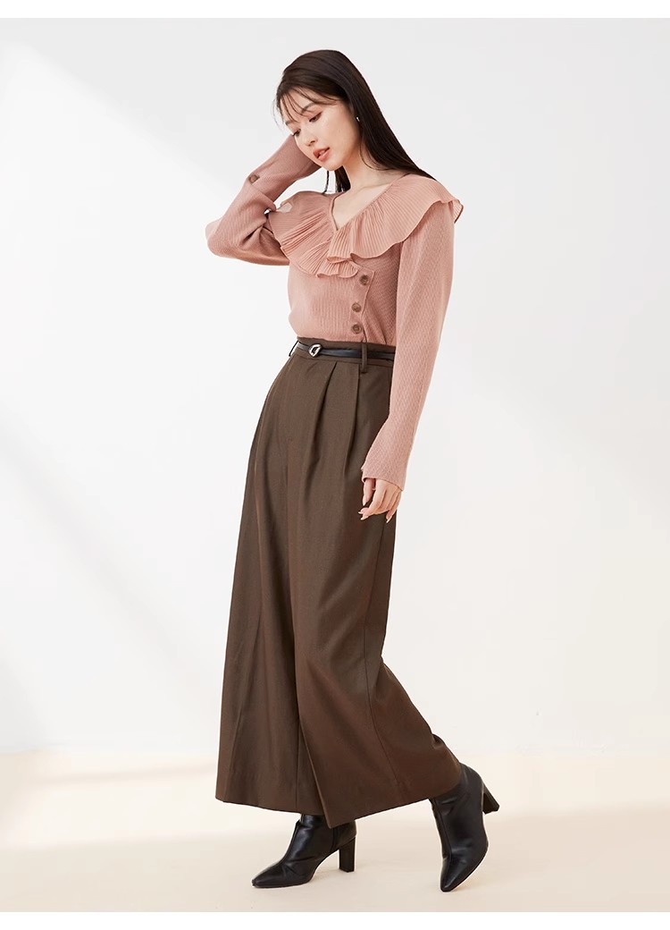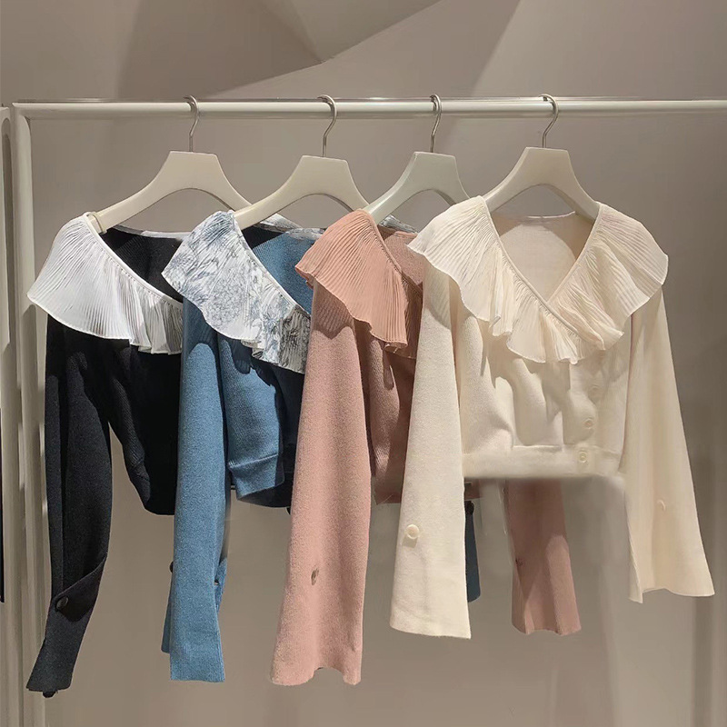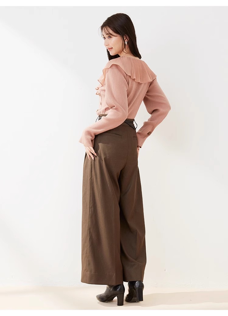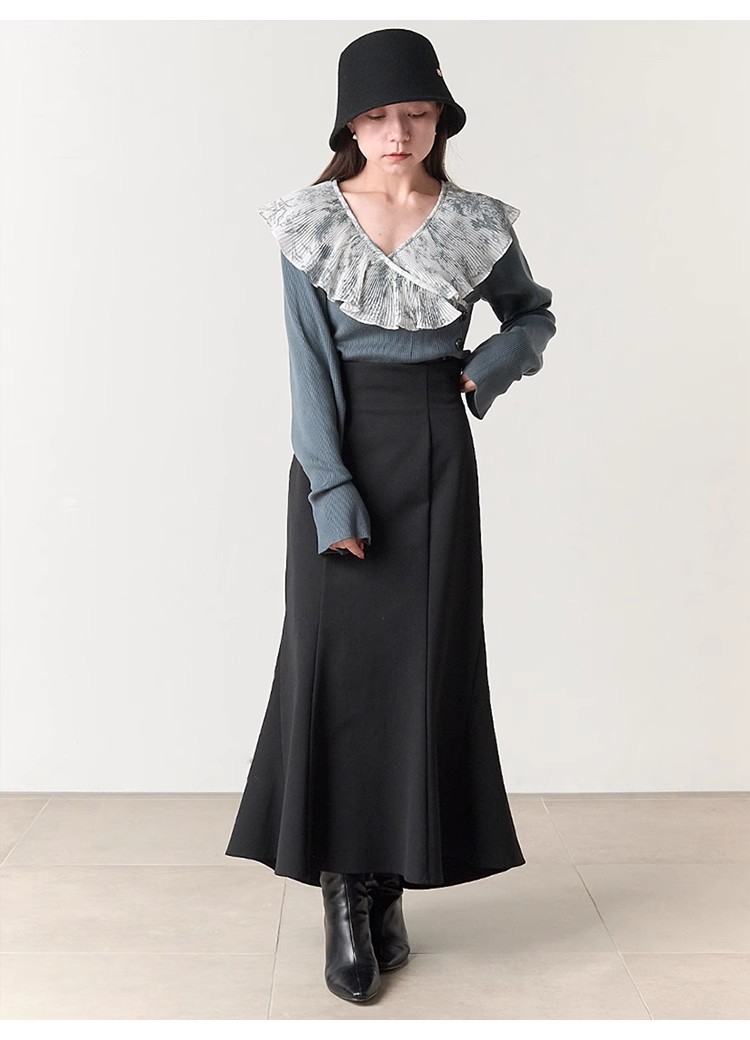 エアリーなシフォンの襟がドッキングされた、クラシカルレディなニットプルオーバー。シフォンカラーには細かいプリーツを畳み、ボリュームがありながらも軽く見えるように工夫しました。袖と身頃にはボタンをあしらい細部のディテールにもこだわった1着。すっきりとしたシルエットなので合わせるボトムを選ばず、幅広いコーディネートに取り入れられます。
