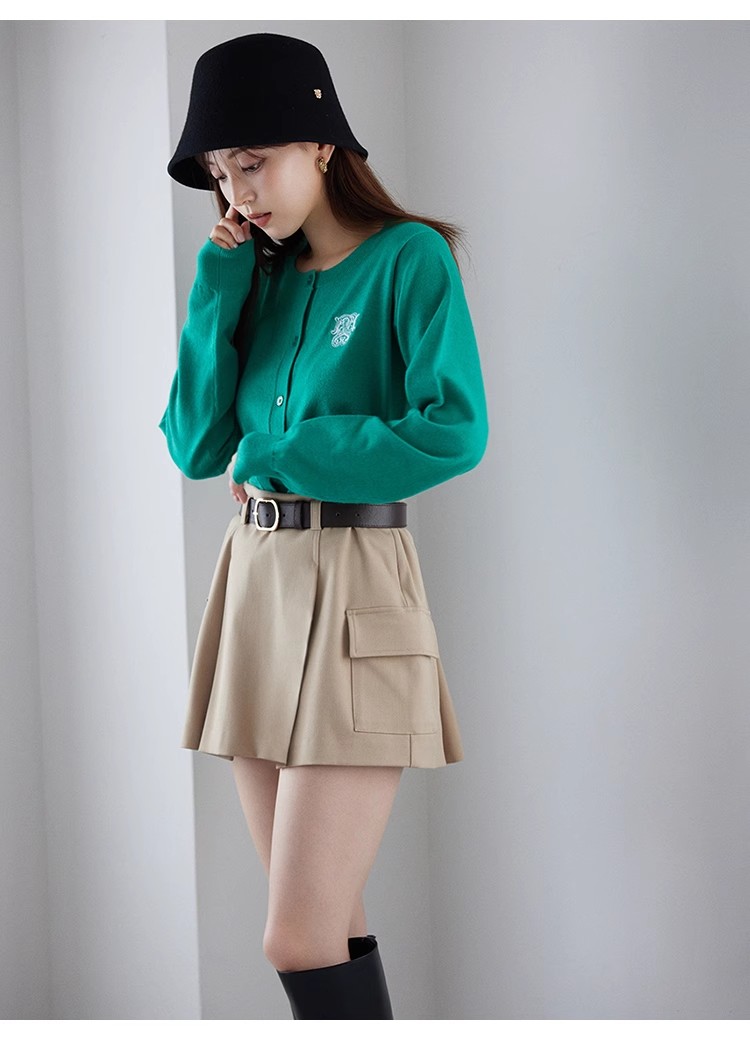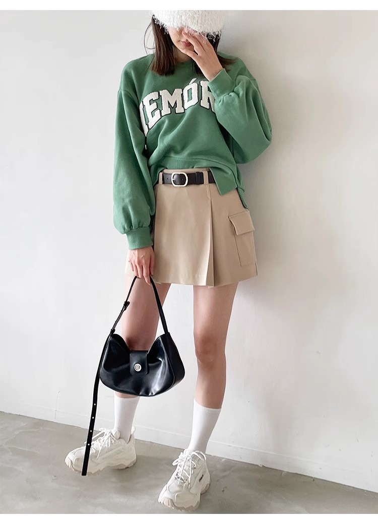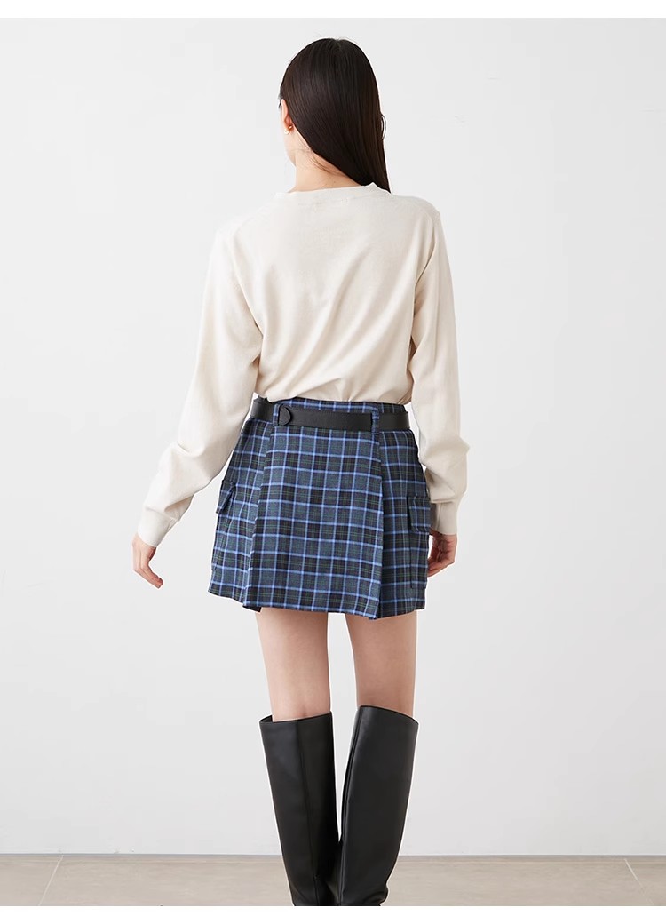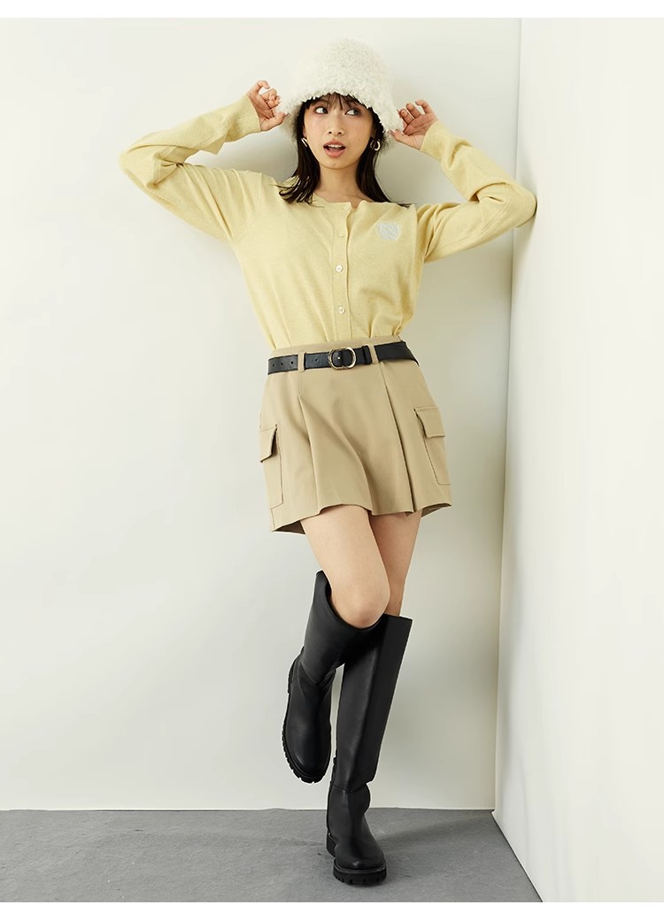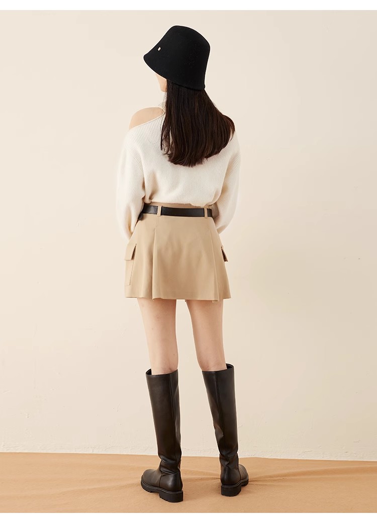 トレンド感のあるローウエストのミニスカショ。中がパンツになっているのでミニ丈も安心して着ていただけます。サイドのフラップポケットでカーゴ要素をプラスし、キャッチーに仕上げました。広がりすぎないボックスプリーツと、セットになったフェイクレザーベルトでキレを加えることで、グッと大人っぽく。ベルトは取り外して単品使いも可能です。ロゴニットなどを合わせたカジュアルなスタイリングが特におすすめです。