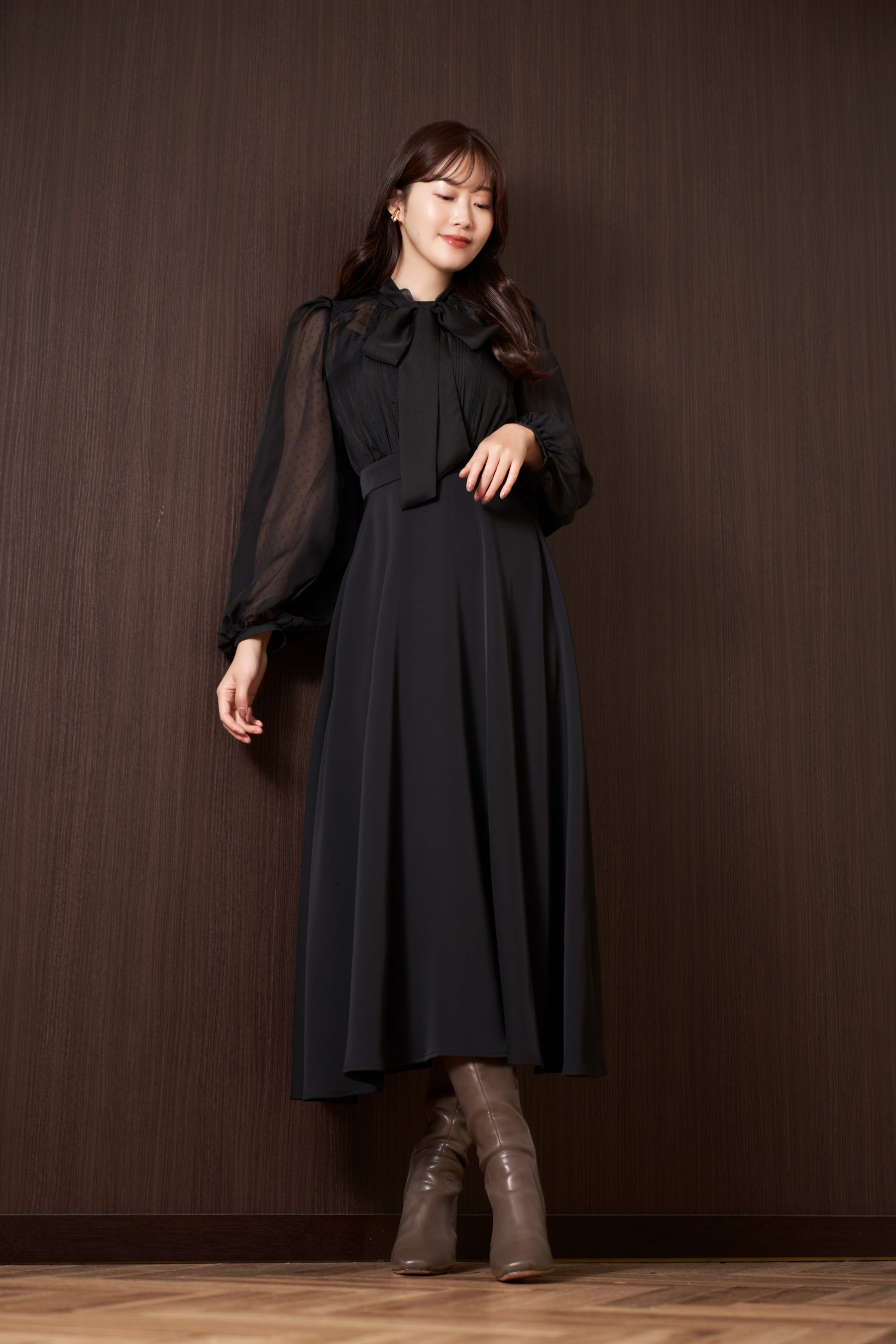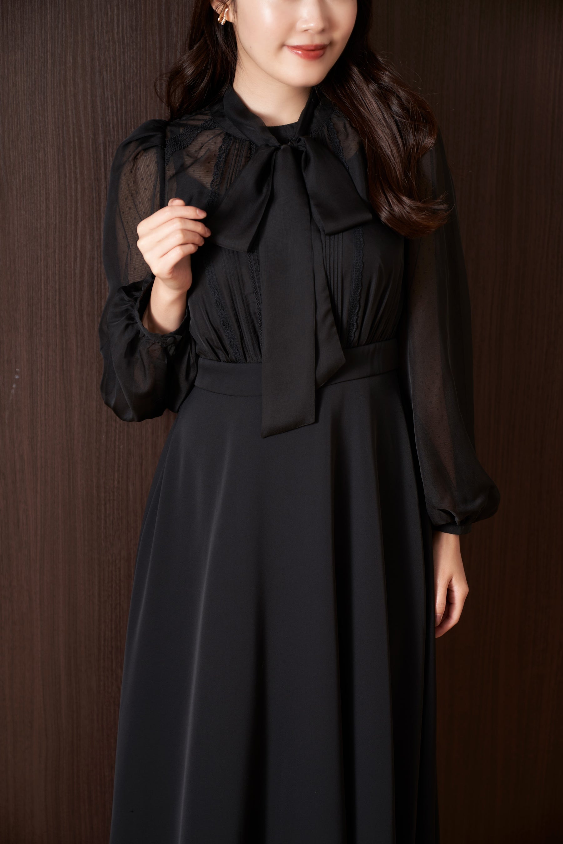フロントでタイ風にしたり、バックリボンにしたりと自由に位置を決められるボウタイデザインで仕上げました。