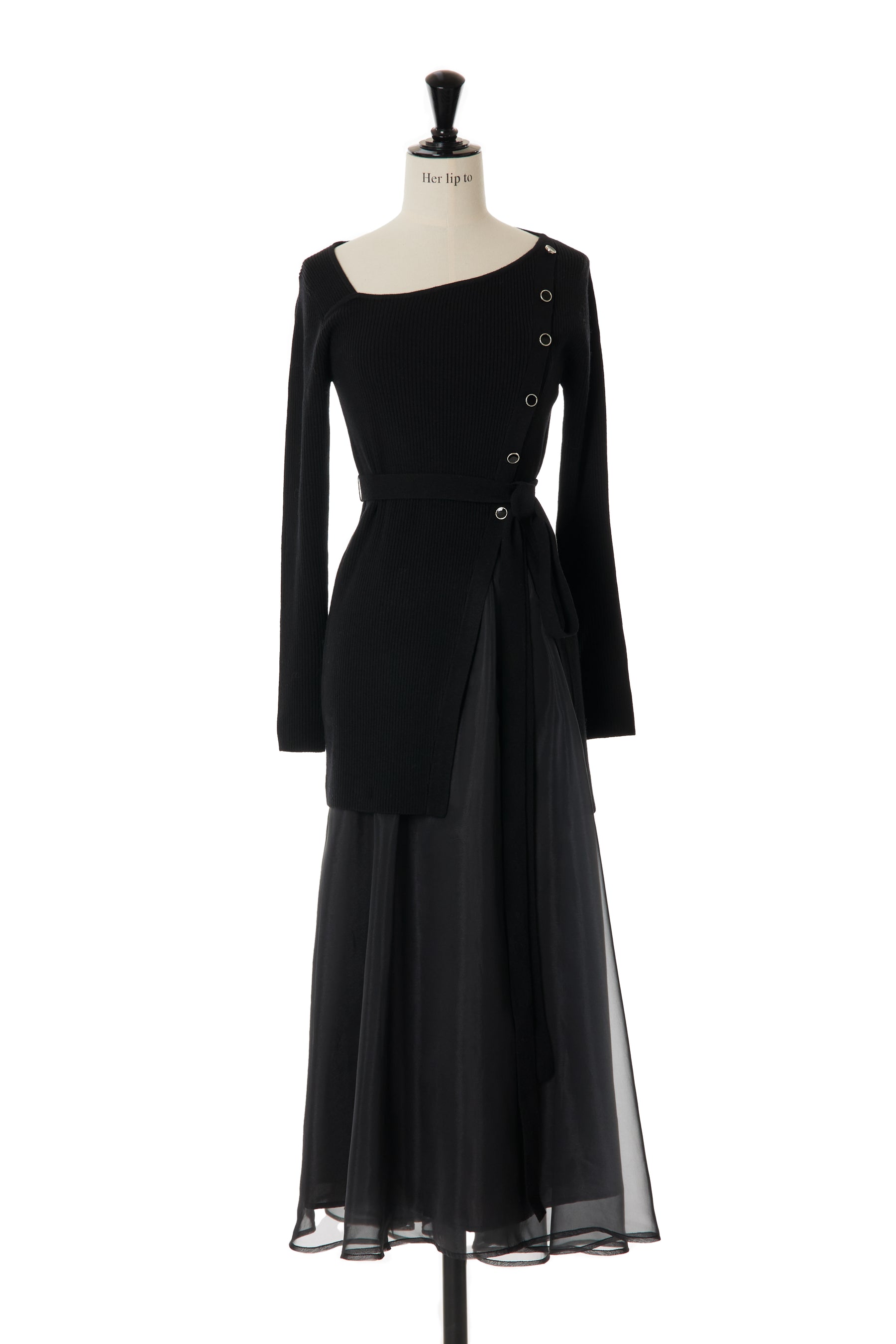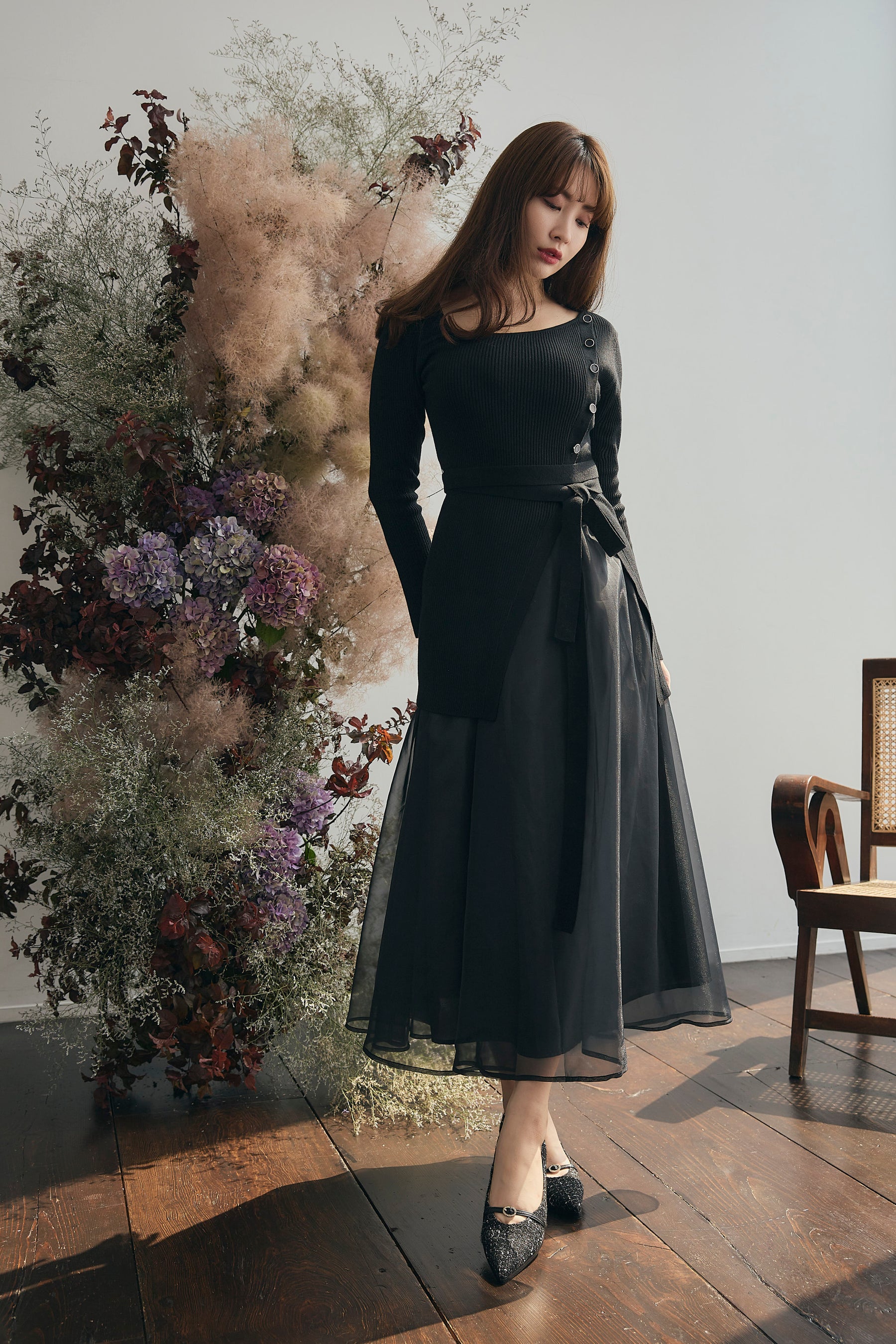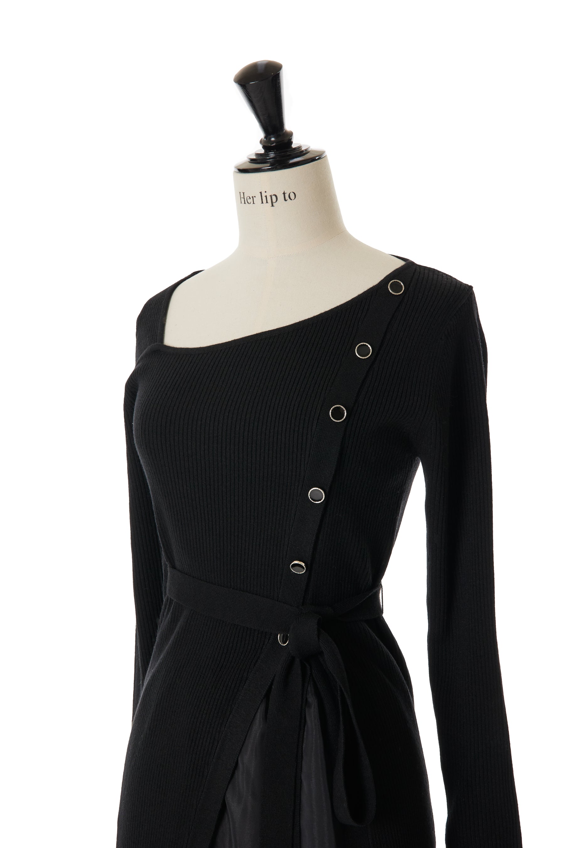 ニットのボタンを起点に広がるスリットが、縦ラインと女性らしいシルエットをエレガントに魅せてくれます。