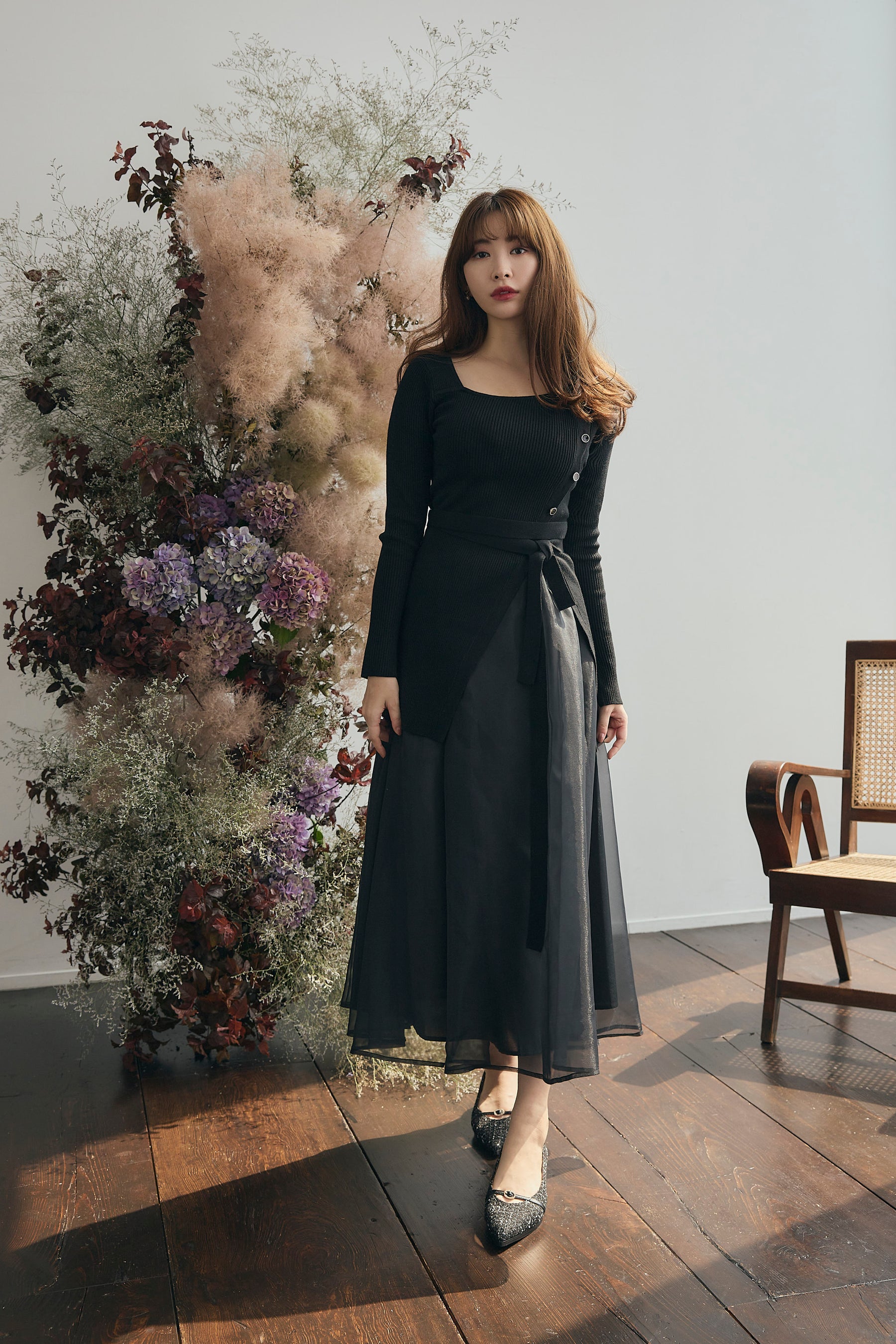 ボリュームのあるスカートとタイトなトップスを合わせることで、よりエレガントさが際立つアイテムです。