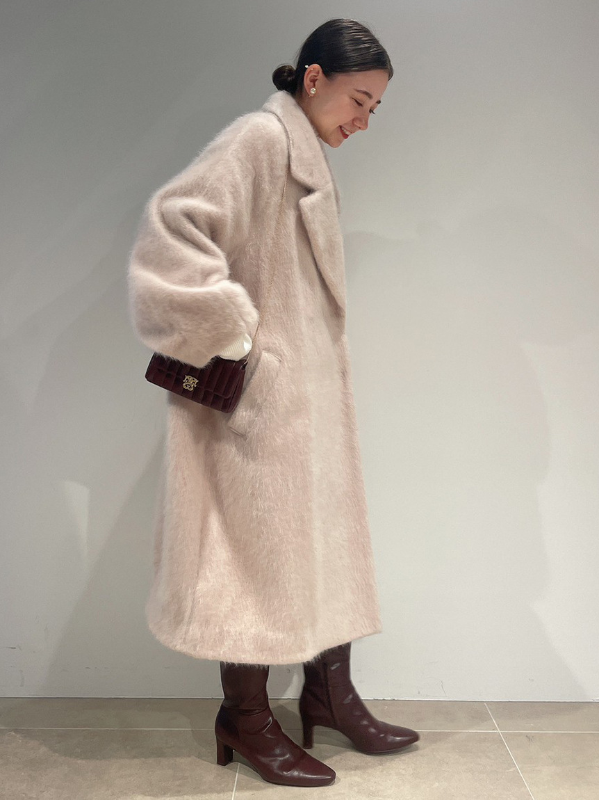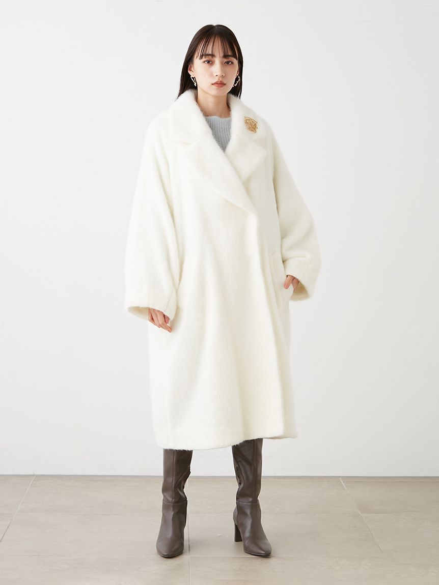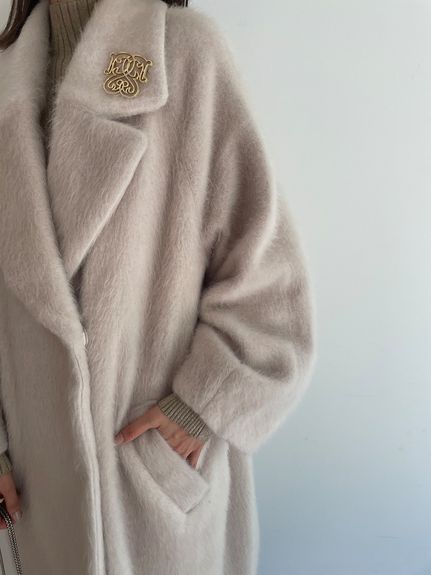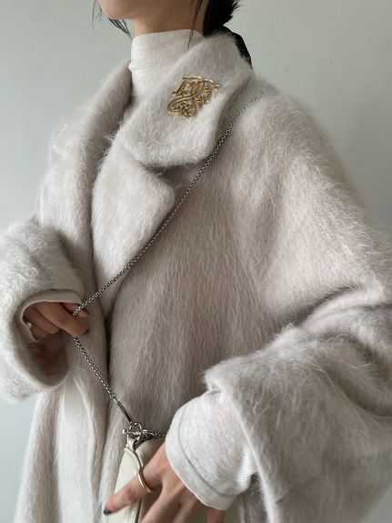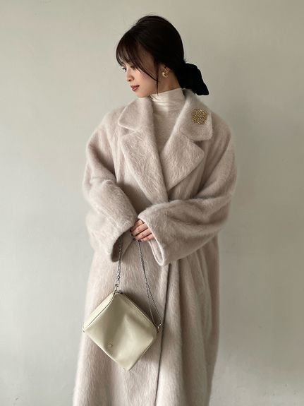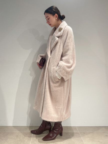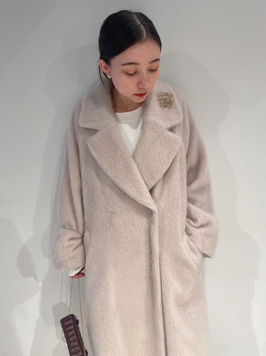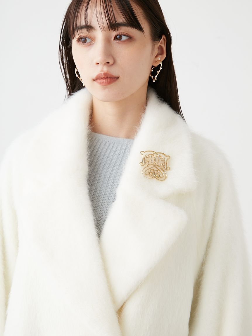 季節感が一気に高まるシャギーコートは、今年のトレンド。柔らかく繊細な毛流れが優美に映え、女らしさを高めてくれます。膝が隠れるくらいの程よいレングスのコクーンシルエットで、後ろから見たときのボリューム感も印象的。袖にも贅沢に生地を使用することで、たぷっとした愛くるしいフォルムをメイク。仕上げにオリジナルロゴのブローチを付け、ワンポイントに。ブローチは取り外し可能なので、お手持ちのコートやニットなどにもお使いいただけます。