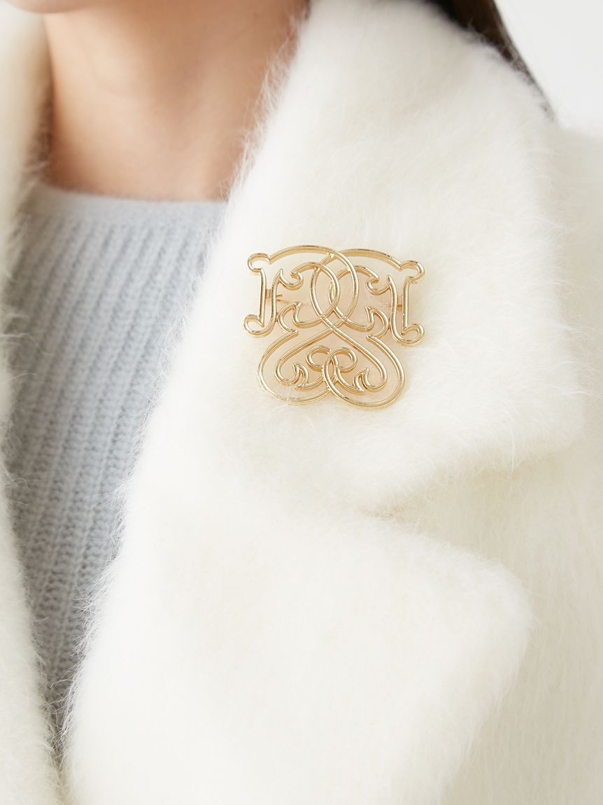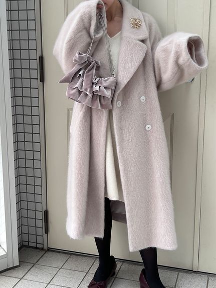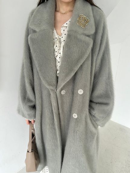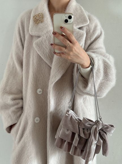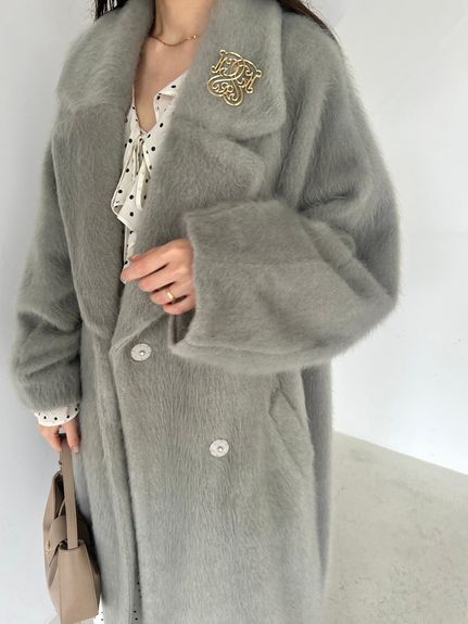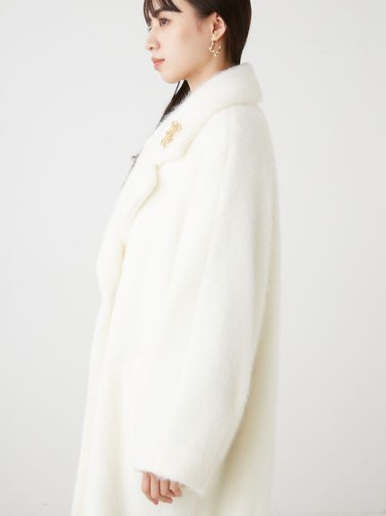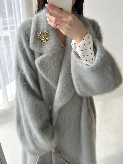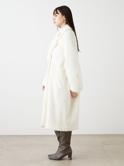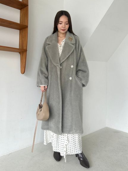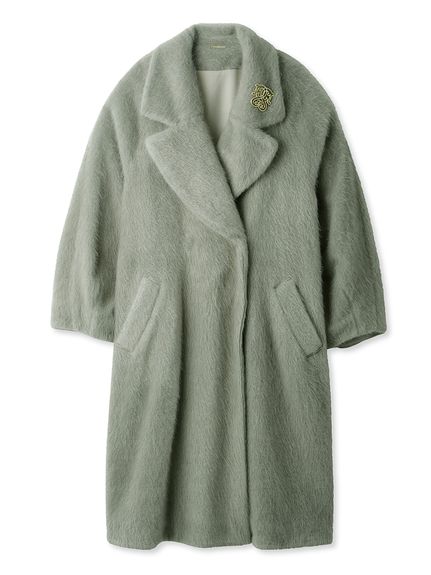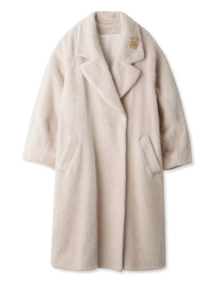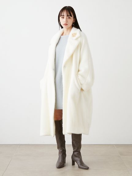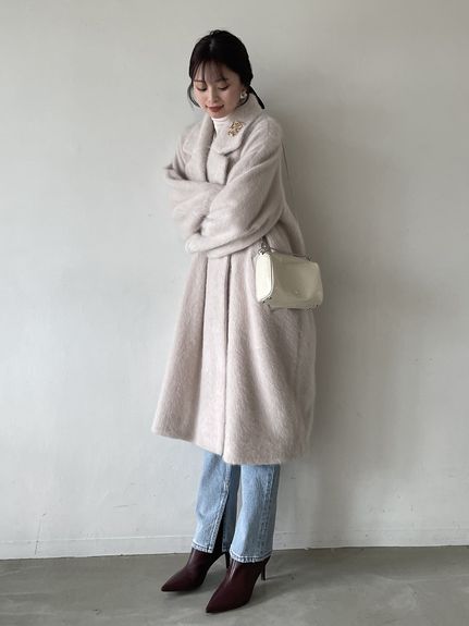 季節感が一気に高まるシャギーコートは、今年のトレンド。柔らかく繊細な毛流れが優美に映え、女らしさを高めてくれます。膝が隠れるくらいの程よいレングスのコクーンシルエットで、後ろから見たときのボリューム感も印象的。袖にも贅沢に生地を使用することで、たぷっとした愛くるしいフォルムをメイク。仕上げにオリジナルロゴのブローチを付け、ワンポイントに。ブローチは取り外し可能なので、お手持ちのコートやニットなどにもお使いいただけます。