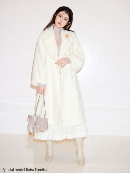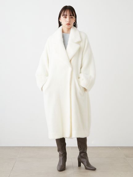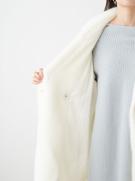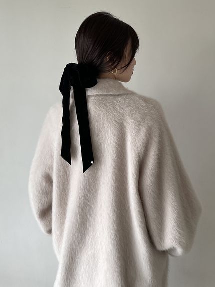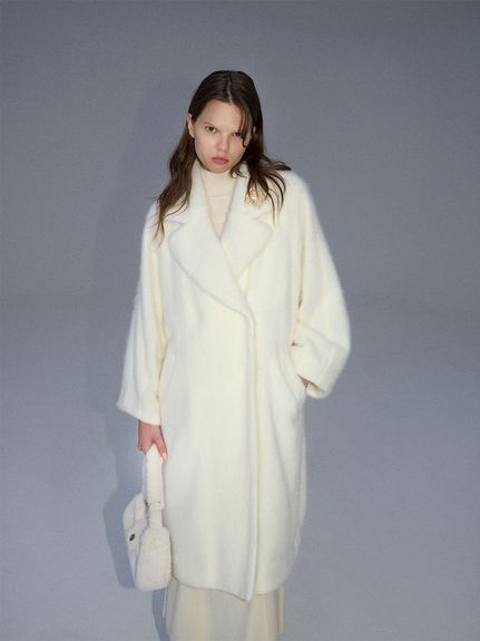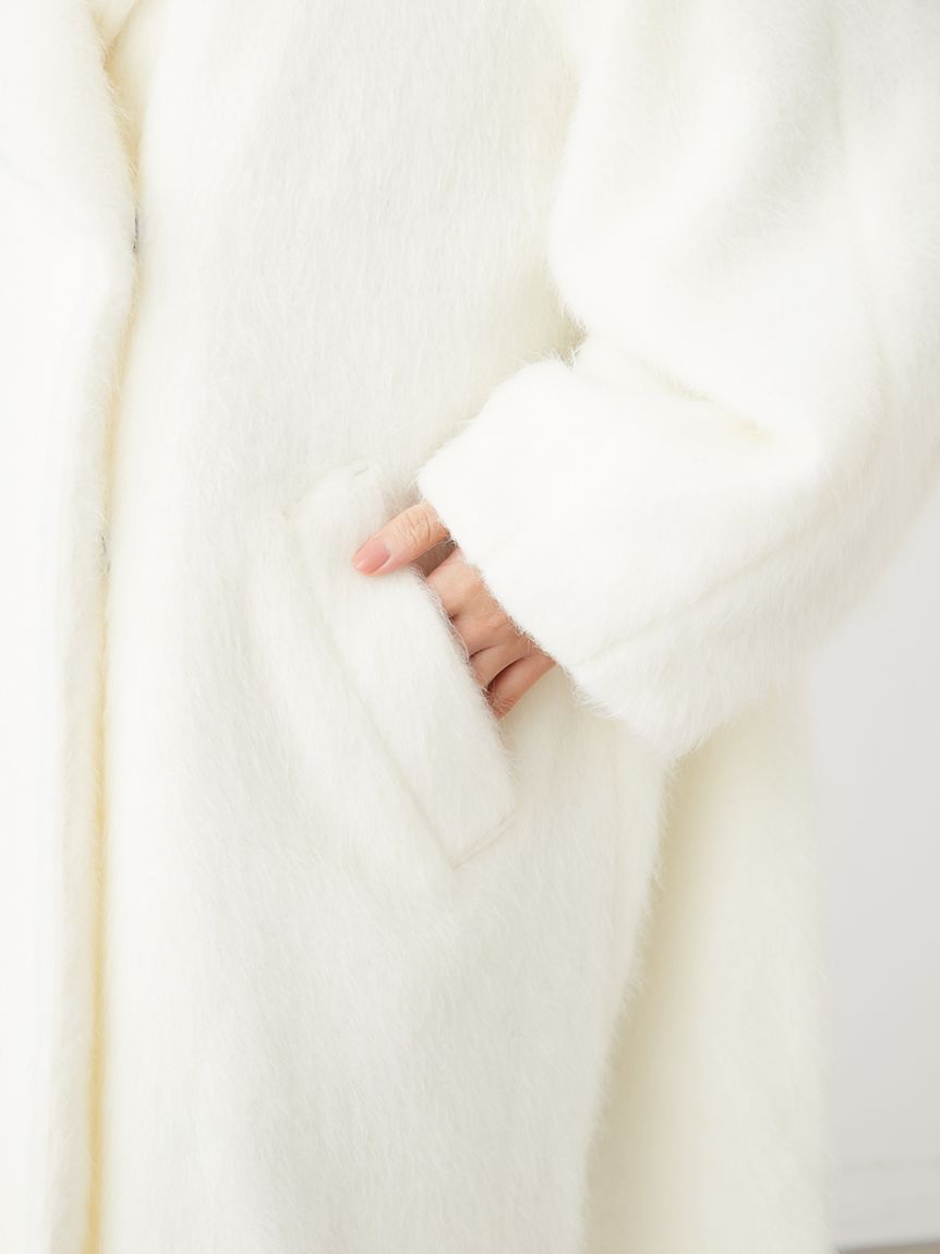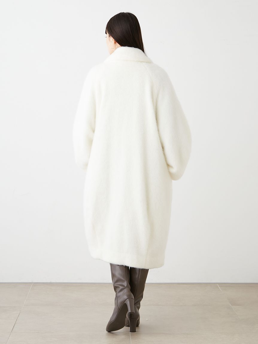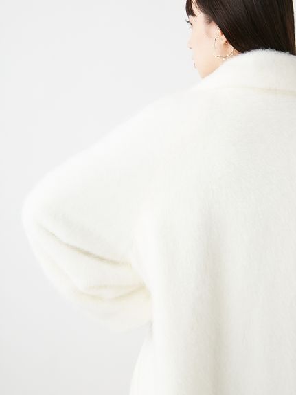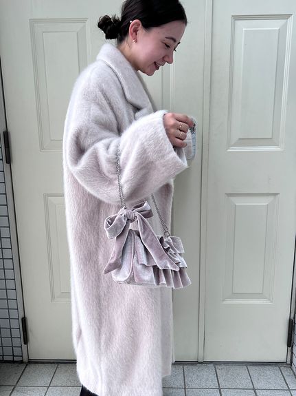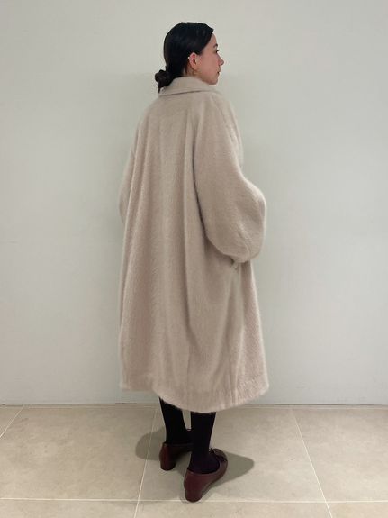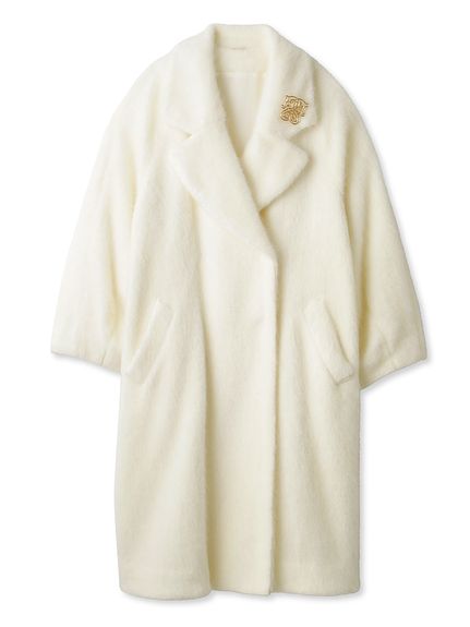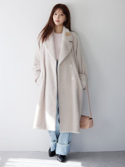 季節感が一気に高まるシャギーコートは、今年のトレンド。柔らかく繊細な毛流れが優美に映え、女らしさを高めてくれます。膝が隠れるくらいの程よいレングスのコクーンシルエットで、後ろから見たときのボリューム感も印象的。袖にも贅沢に生地を使用することで、たぷっとした愛くるしいフォルムをメイク。仕上げにオリジナルロゴのブローチを付け、ワンポイントに。ブローチは取り外し可能なので、お手持ちのコートやニットなどにもお使いいただけます。