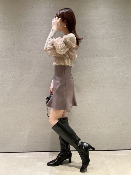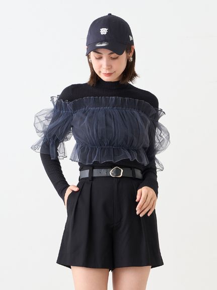 SNIDELで人気のチュールトップスをニットにドッキングしました。ベアデザインのチュールは、ギャザーやプリーツ、フリルなどで華やかに盛り上げてボリュームたっぷりに。その存在感を引き立てるのは、ほんのりシアーなニットプルオーバー。上品なハイネックデザインにすることで、甘すぎず大人っぽく着られる一枚に仕上げました。チュールベアとニットが作るメリハリに、上半身華奢見え効果も期待できます。今シーズンなら、ショーパン&ロングブーツとのスタイリングが特におすすめです。