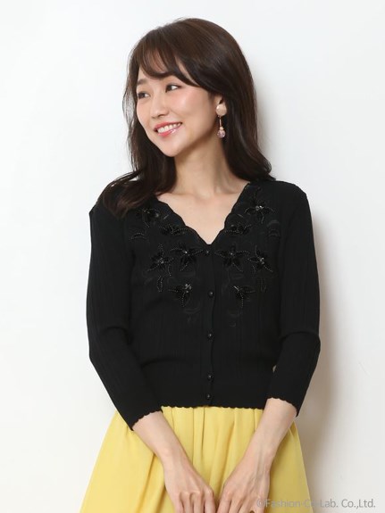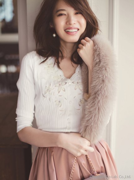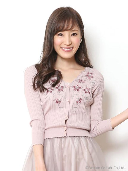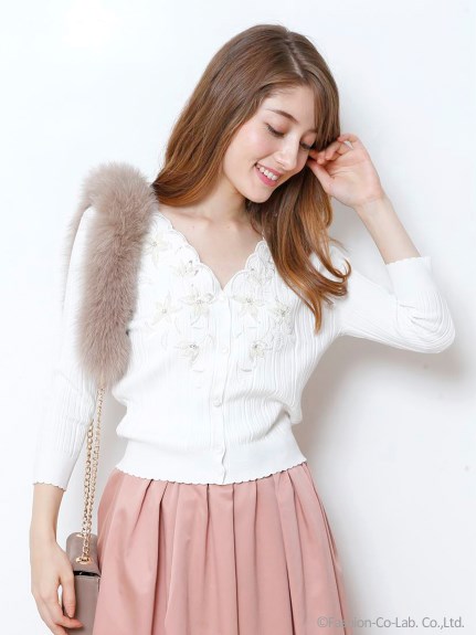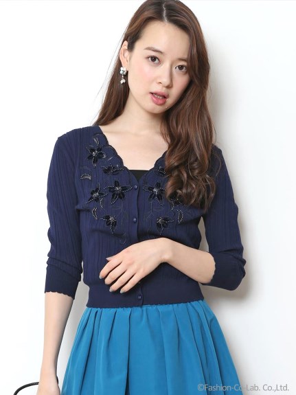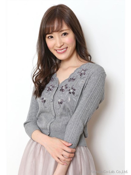 フロントのモール刺繍デザインが、レトロな印象を与えるカーディガン。ネックラインのカッティングが、ガーリームードを盛上げます。バランスの取りやすい、コンパクト丈も魅力的。 素材 本体:レーヨン69%、ポリエステル31%/刺繍糸:(上糸)レーヨン100%(下糸)ポリエステル100% サイズ表記 総丈 肩幅 袖丈 袖ぐり バスト F 49cm 34cm 56cm 42cm 80cm