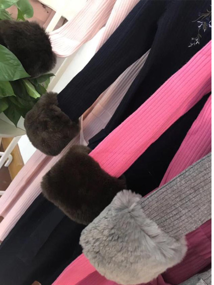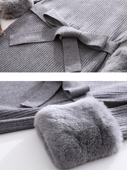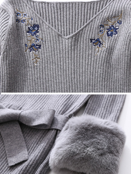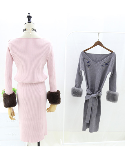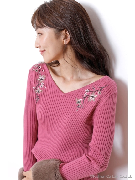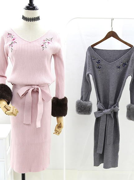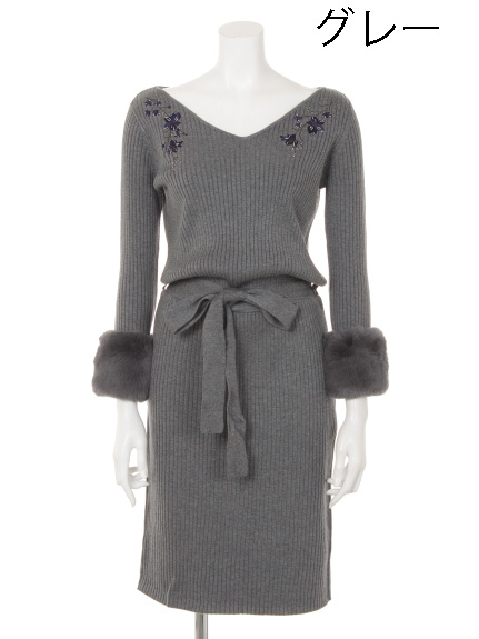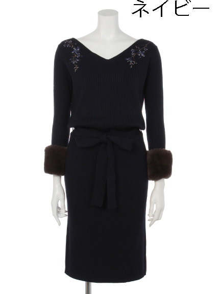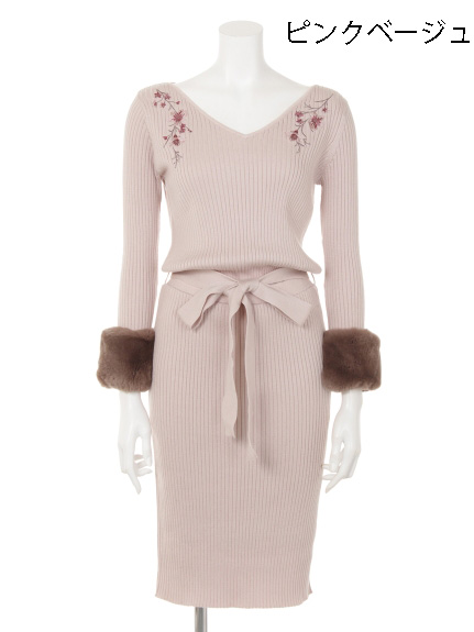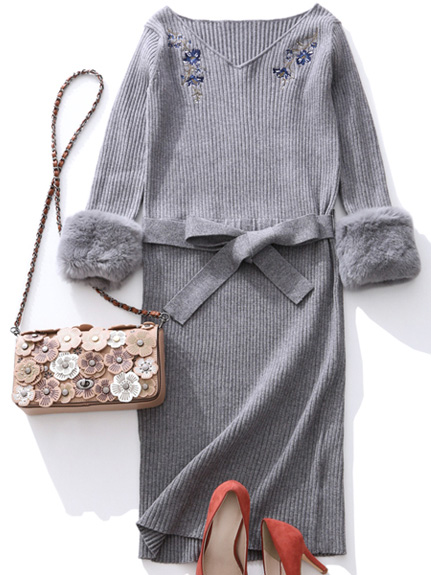 フラワーモチーフの刺繍が、レディライクなアクセントを添えるワンピース。広めのVネックで、デコルテをスッキリ見せてくれます。袖口に飾ったファーモチーフもチャーミング!